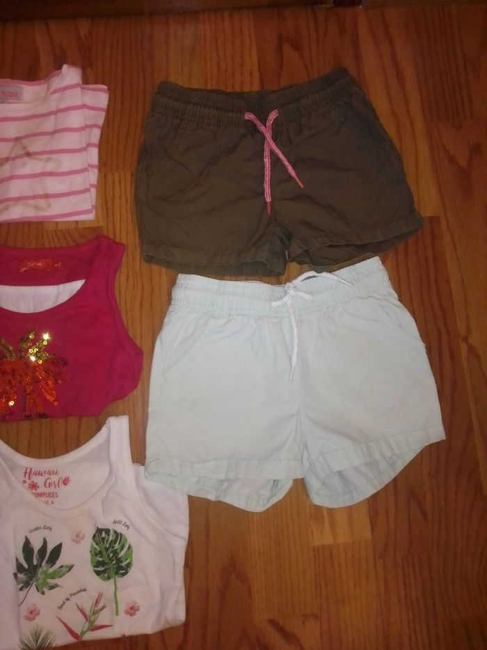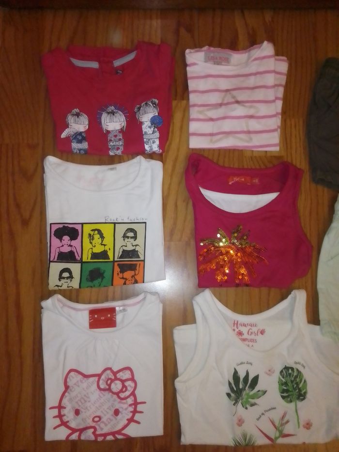 Joli lot été 4 ans composé de: * 2 débardeurs * 4 tee shirts manches courtes * 2 shorts Marques Sergent Major, Complices, Lisa Rose, Hello Kitty, Pick Ouic, Lulilu et Tissaia Le tout en très bon état A noter une petite tâche sur le bas du tee shirt Hello Kitty Prix ferme merci