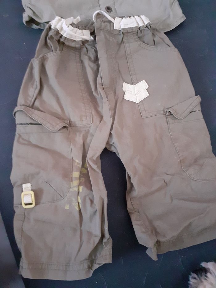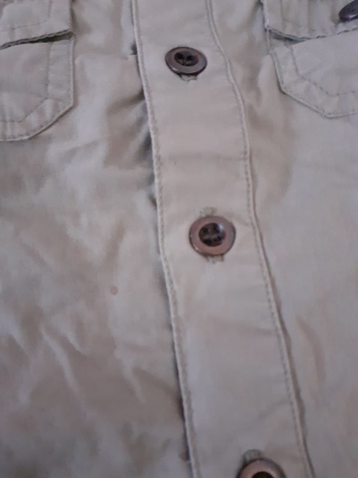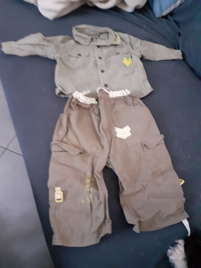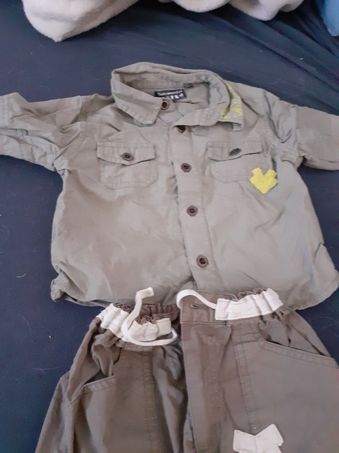 Ensemble pantalon et chemise taille 12 mois Marque tout compte fait Il y a une petite tâche sur la chemise ( voir photo 4) et il y a une tâche collante sur la chemise ( voir dernière photo) car j'avais mis une étiquette autocollante pour noter le nom de mon fils