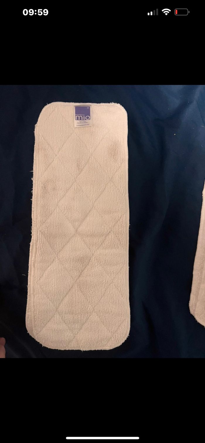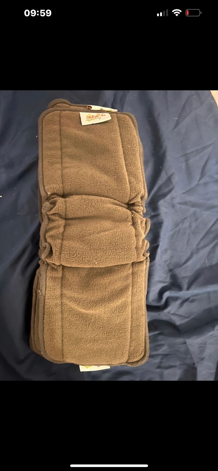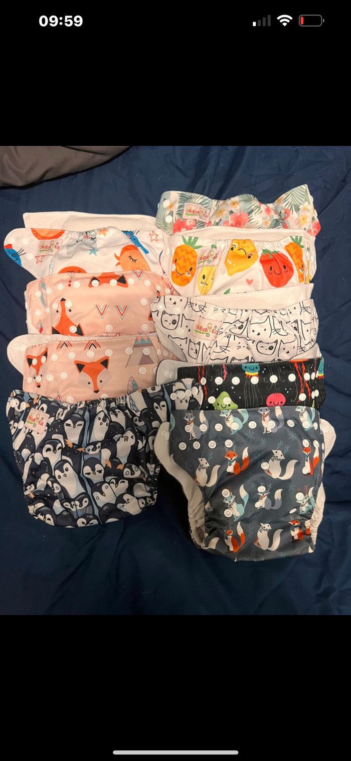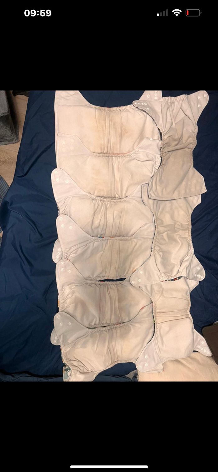9 couches lavables marque obabyka Avec 19 inserts blanches/ 12 noirs et 3 mio Quelques traces d’usure voir photo, le blanc est passé. C’est taille unique avec les boutons vous pouvez régler la taille. Acheté 150 euros le tout