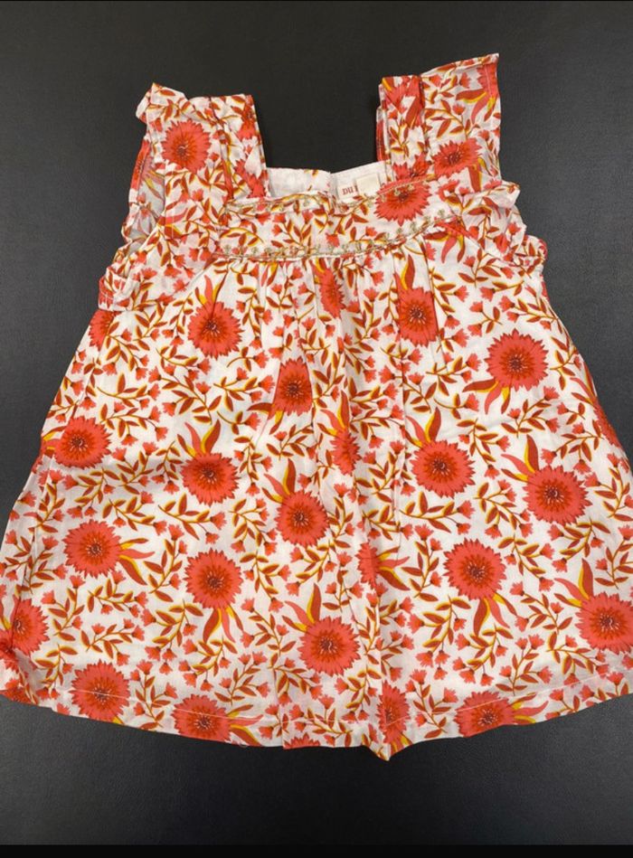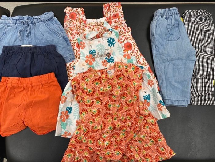 Lot composé : - short jean Benetton - short bleu marine play up - short orange in extenso - robe à motif + culotte marque inconnue - robe fleurs rose/bleu/vert Disney baby - robe fleur rouge/ orange du pareil au même - jean léger sergent major - pantalon léger petit bisou Articles en très bon état et tous taille 6 mois