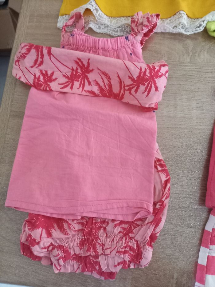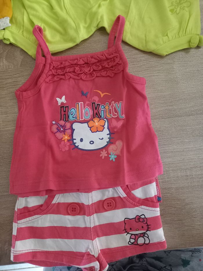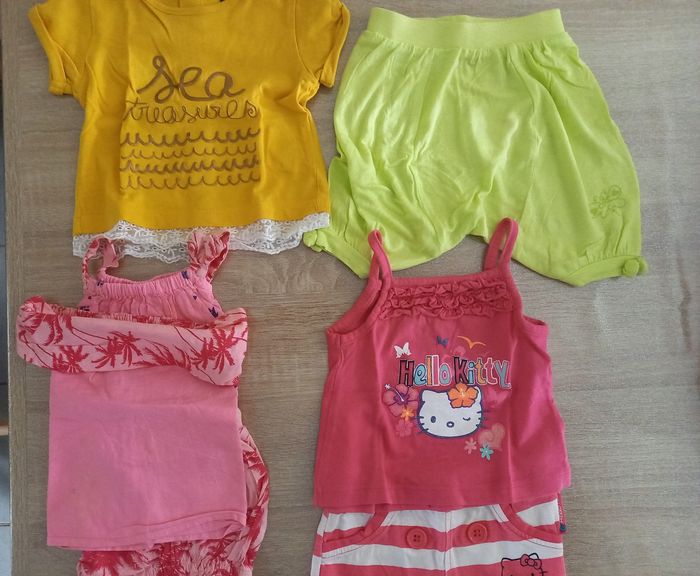 Vends un ensemble t-shirt débardeur hello kitty, un ensemble 3 pièce short débardeur bandeau kimadi, un sarouel orchestra et un t shirt kiabi