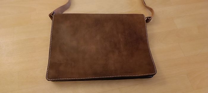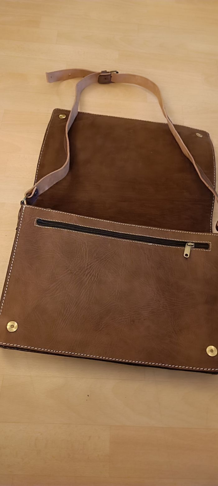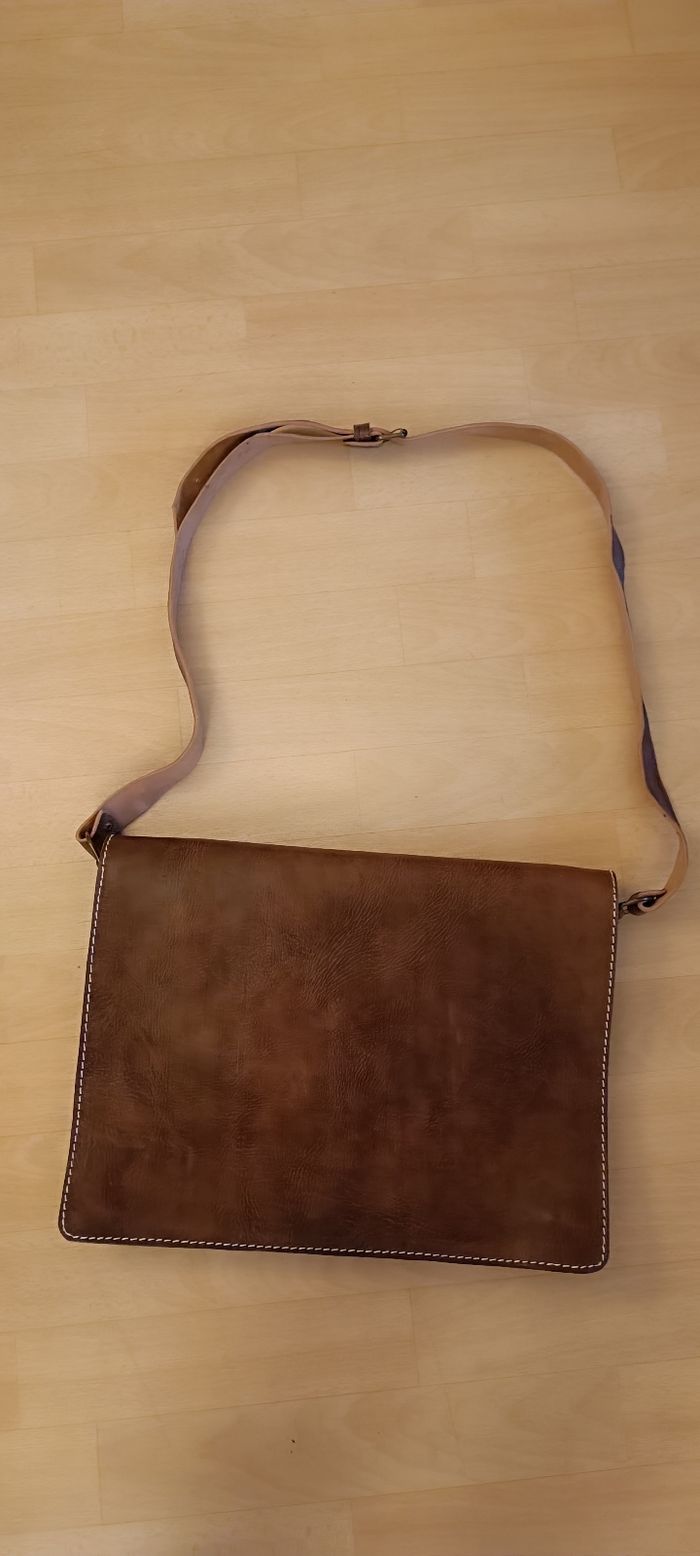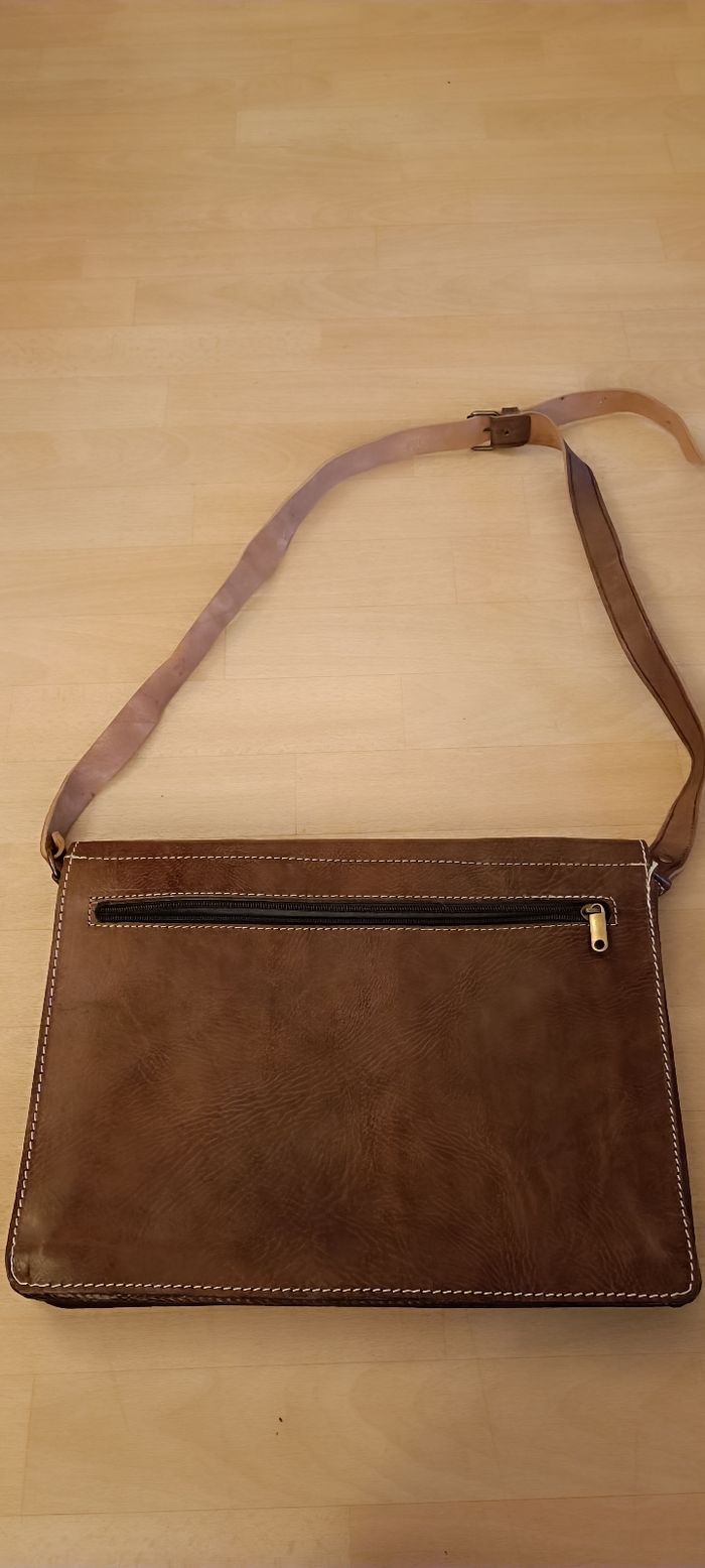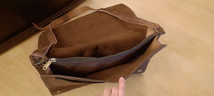 Grande sacoche en cuir coloris marron foncé Avec 3 compartiments Poches zippées extérieur Bandoulière réglable Dimensions 41 x 30 cm État neuf et emballé