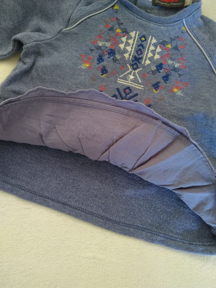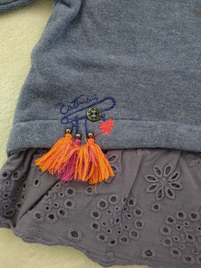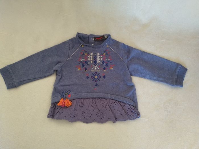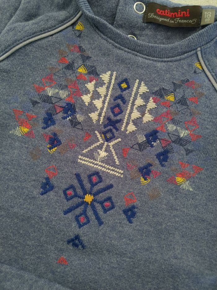 Pull/Sweat à manches longues Marque Catimini Taille 18 mois, 80 cm • Coloris bleu, violet, orange... • Broderie géométrique sur le haut • Broderie ajourée sur le bas • Pompons sur le bas • Pressions au dos En très bon état #evelyne_filles_18mois #evelyne_filles