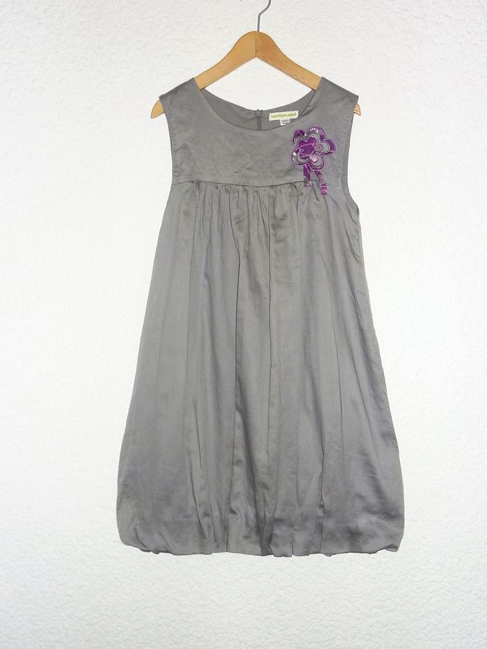 Robe grise, forme boule, matière fluide très élégante, ornée d'une fleur brodée couleur violette. Etat excellent.