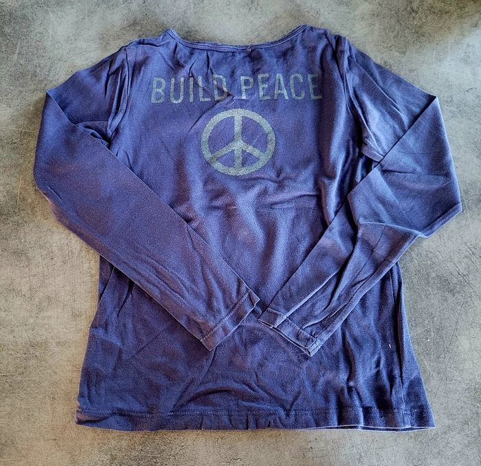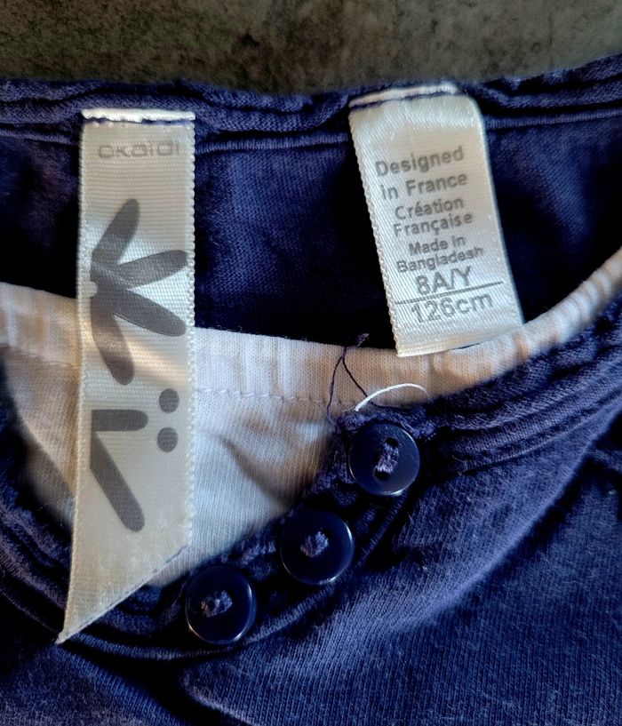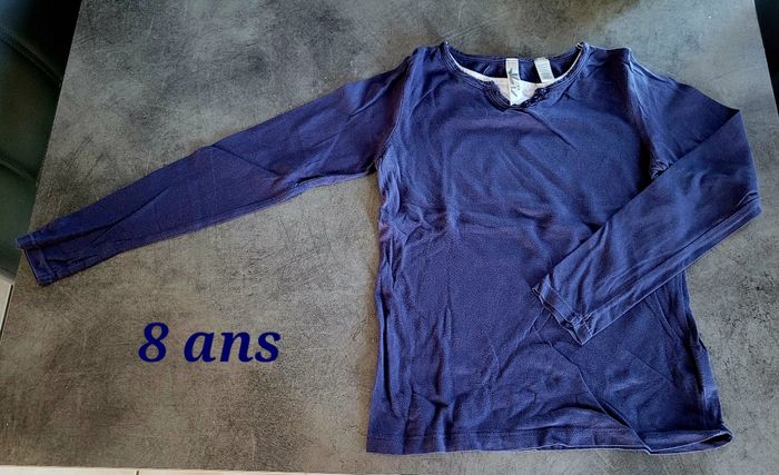 T-shirt manches longues en coton bleu avec un petit détail fantaisie sur le devant et motif fantaisie dans le dos
