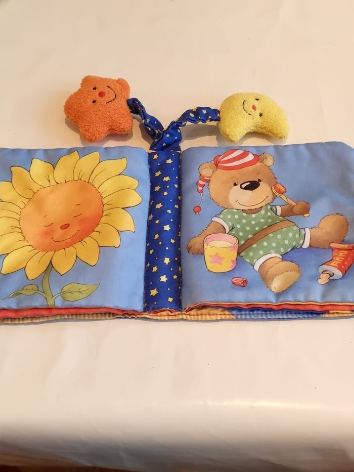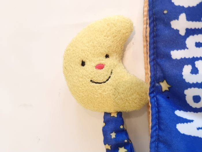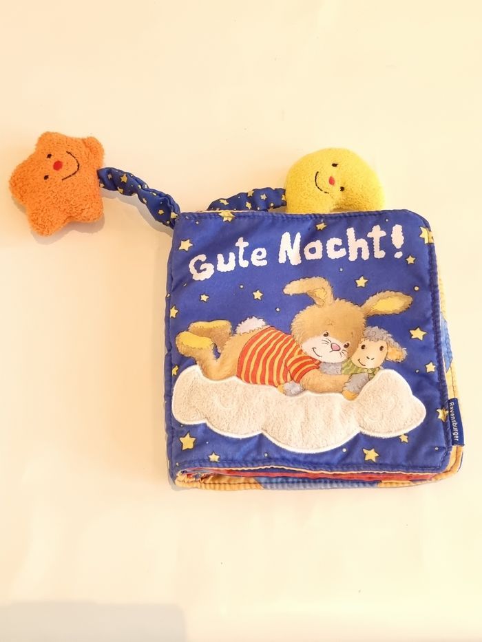 Livre en tissus bonne nuit ! Pas de texte, imagier en tissu Couverture avec nuage tout doux Ravensburger Avec deux doudous tout doux (lune et étoile). Idéal premier livre pour faire de jolis rêves pour bébé Très bon état