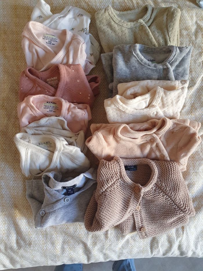 Lot naissance kiabi. Les articles ont tous été achetés neufs et n'ont servi que pour ma fille. Il y a deux bodys légèrement taches. Dans le lot 5 bodys, 4 pyjamas et 2 brassières/gilet.