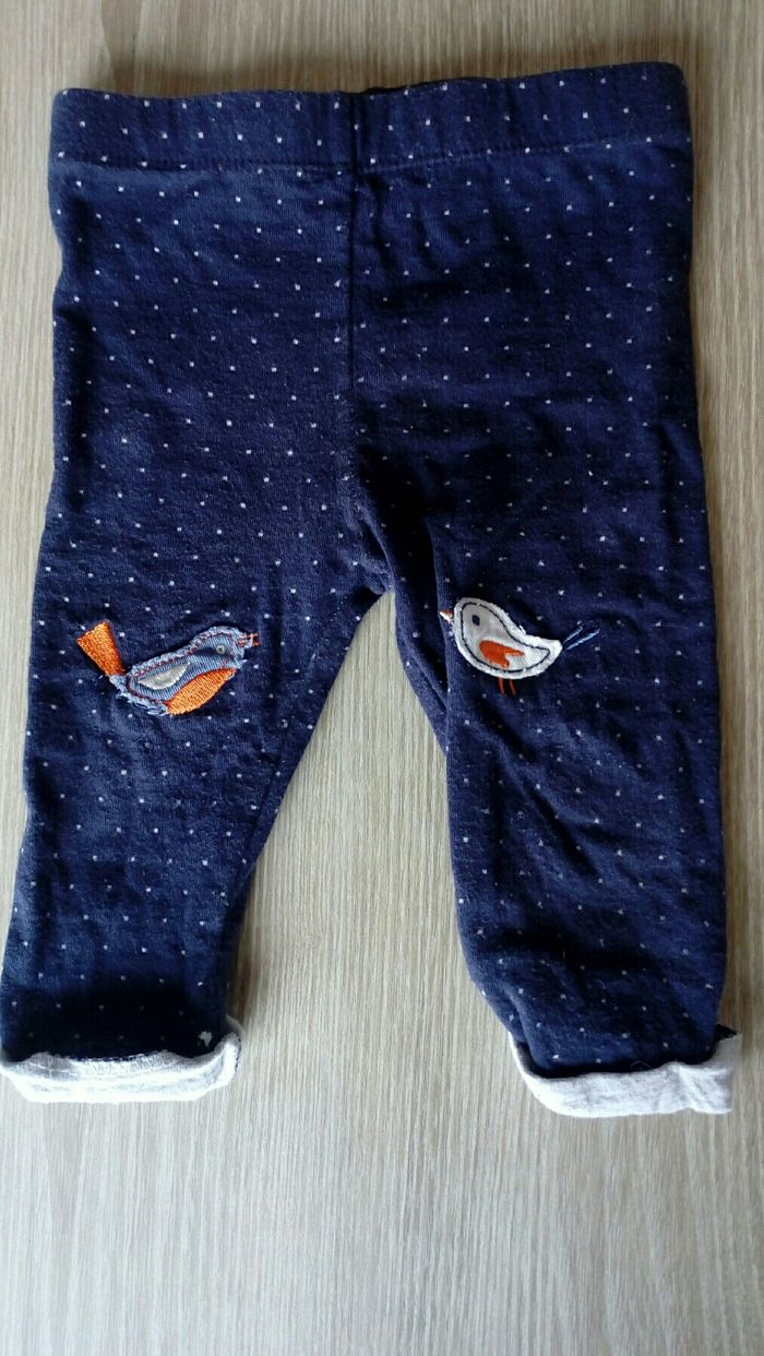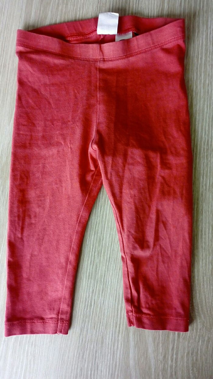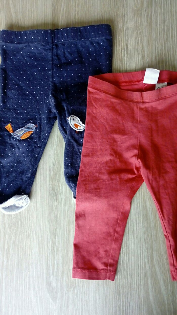 Lot 2 leggings. Le rouge H&M, 74 cm (6-9 mois). Le bleu 12 mois (71 cm), marque Orchestra. Bon état.