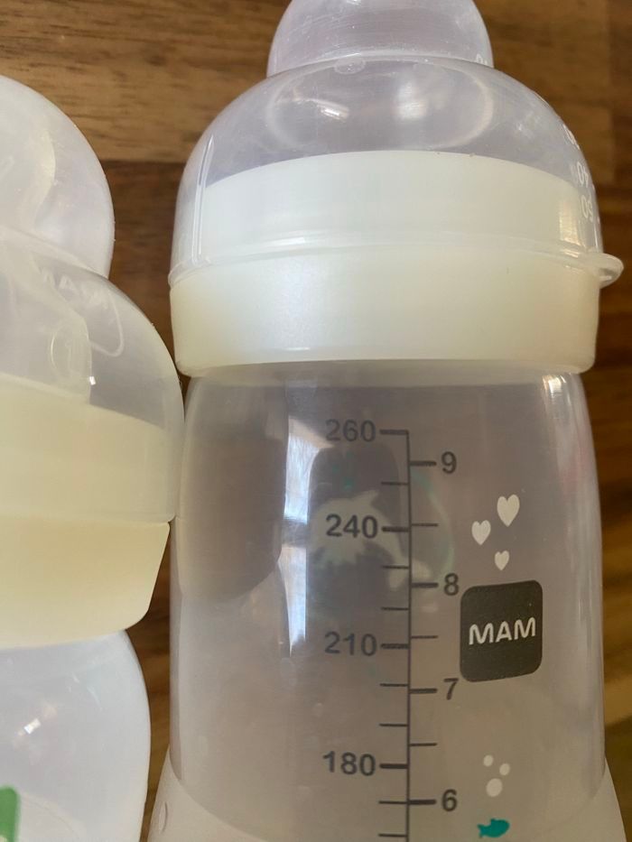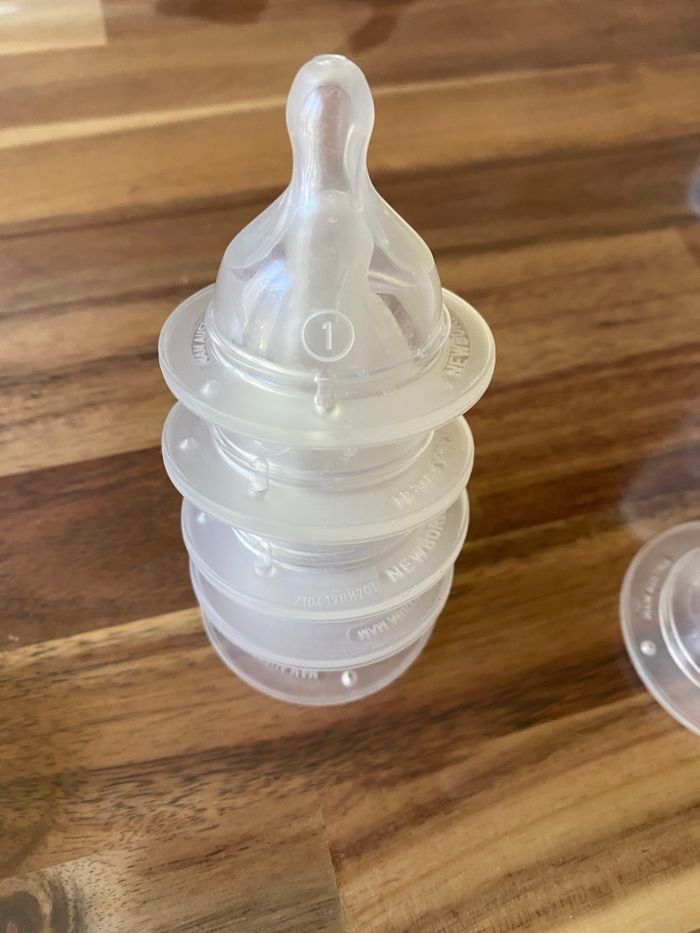 2 biberons avent 130 et 260 ml. TBE 5 tétines niveau 1. Beaucoup servies et peuvent encore servir. 1 tétine niveau 2. 1 doseur a lait.