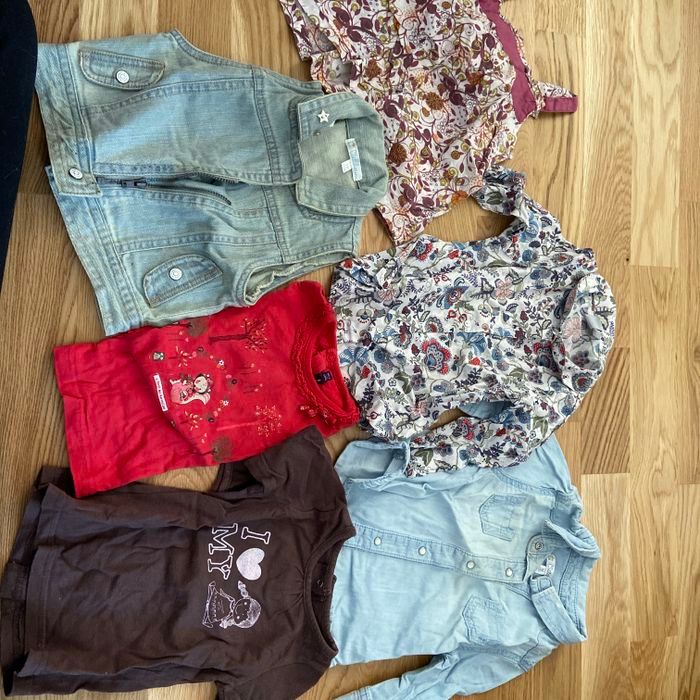 Joli lot de plusieurs type de haut en 9 mois Dont 1 gilet sans manche en jean Jamais porte Très bon état Taille 9 mois