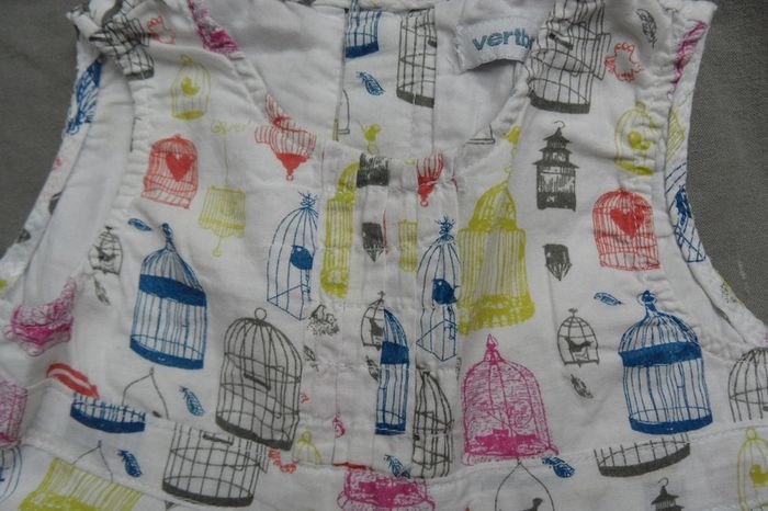 Robe, imprimé cage oiseaux, fermeture par boutons sur l'arrière de la robe, marque verbaudet, taille 6 mois. Très bon état. 👉 Maison non-fumeur, sans animaux. 👉 Réduction sur lot activée ☺️.
