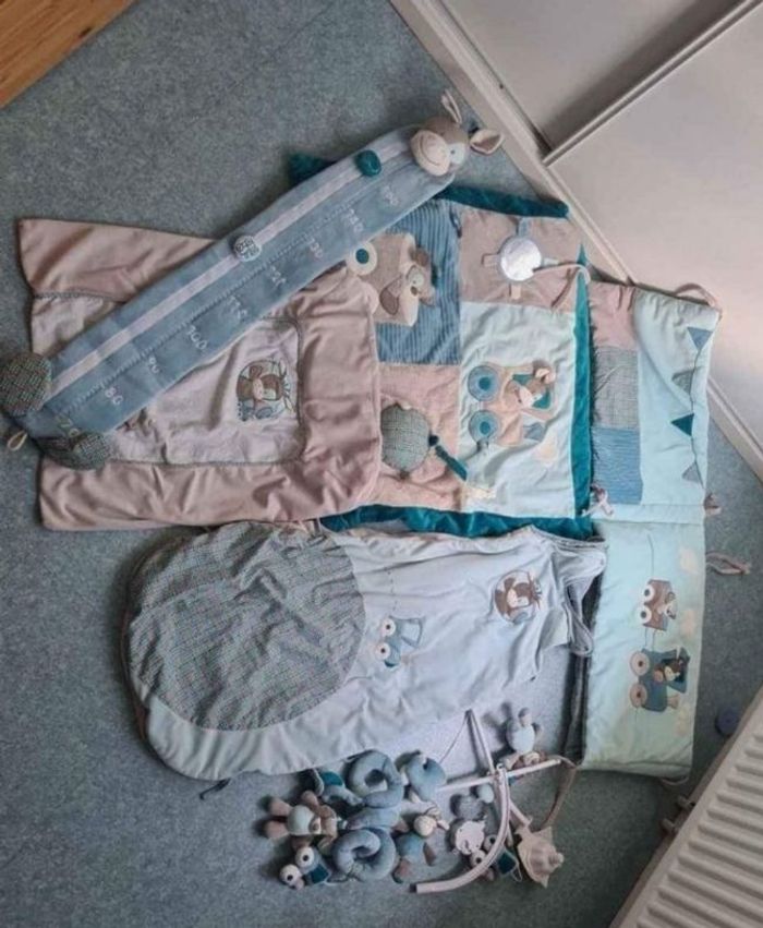 Vend collection en très bon état ! Ce lot contient : 1 gigoteuse 6 / 36 mois 1 tour de lit 1 toise 1 mobile 1 spirale d'éveil 1 housse matelas a langer ( une ou deux tâches rien de méchant) 1 tapis d'éveil ( non il ne manque pas l'arche je ne l'ai juste pas mis en photo, mais si vous souhaitez une photo n'hésitez pas ! Le miroir est un petit peut usée mais il y as toujours le film plastique donc je ne sait pas le réel état du miroir ) Il doit y avoir un doudou que je n'arrive pas à retrouver pour le moment si je le retrouve lors de la vente je l'ajouterai bien entendu dans le colis en cadeau 😊 si vous souhaitez plus de photos surtout n'hésitez pas