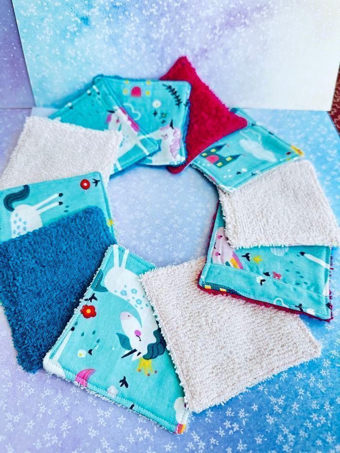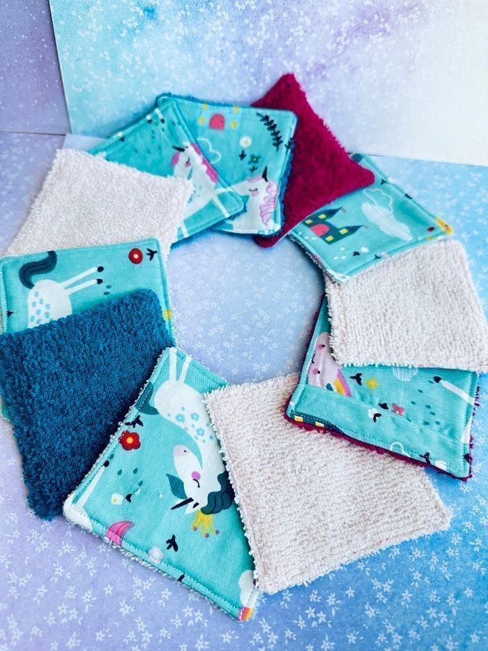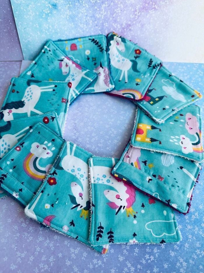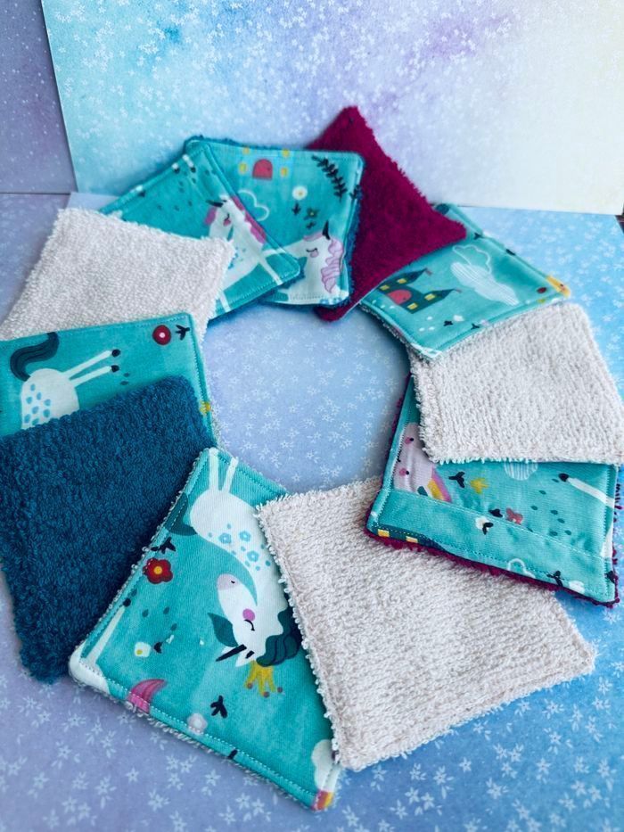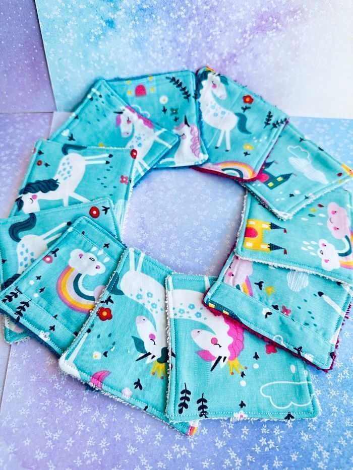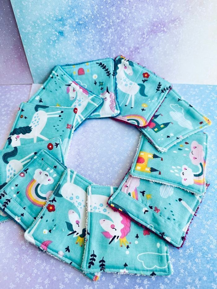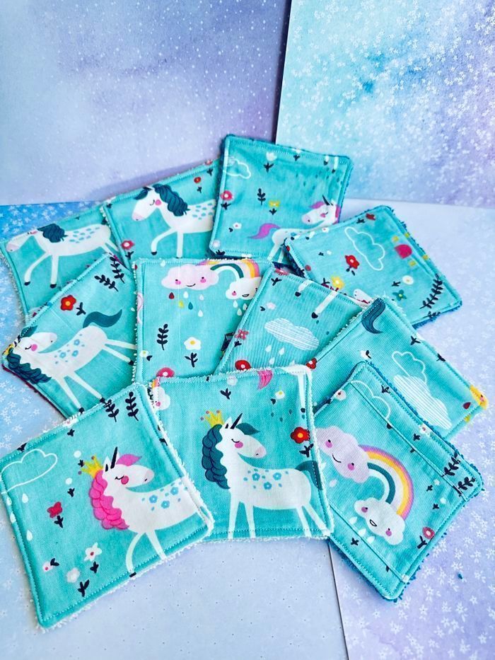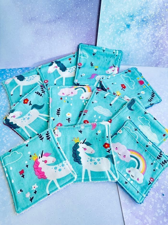 lingettes motifs licorne lavable et réutilisable lot de 11 taille 9x9 cm éponge en coton lavable à 30° pas de sèche linge et l’essorage au minimum pensez à humidifier la lingette avant utilisation plusieurs modèles au choix Envoi rapide et soigné Toutes les lingettes sur @ateliersdisalingettes possibilité de faire en plus grande quantité panier à 10€