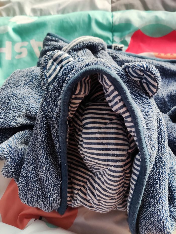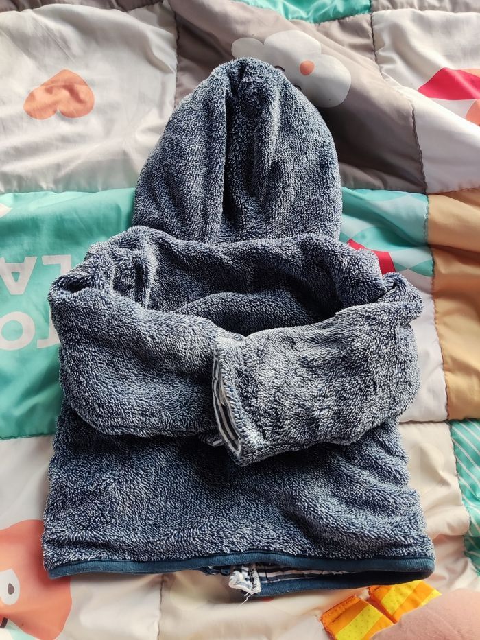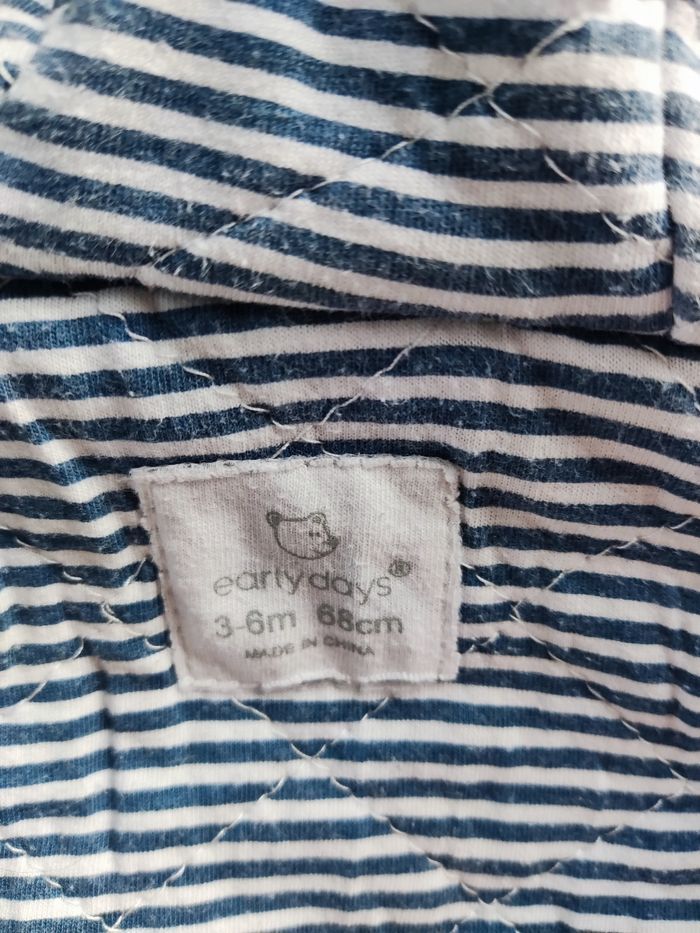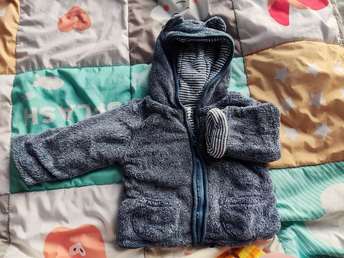 Veste polaire bleu chiné doublée coton rayé bleu et blanc. Petites oreilles mignonnes sur la capuche. Taille 6 mois. Marque Early Days