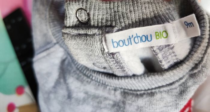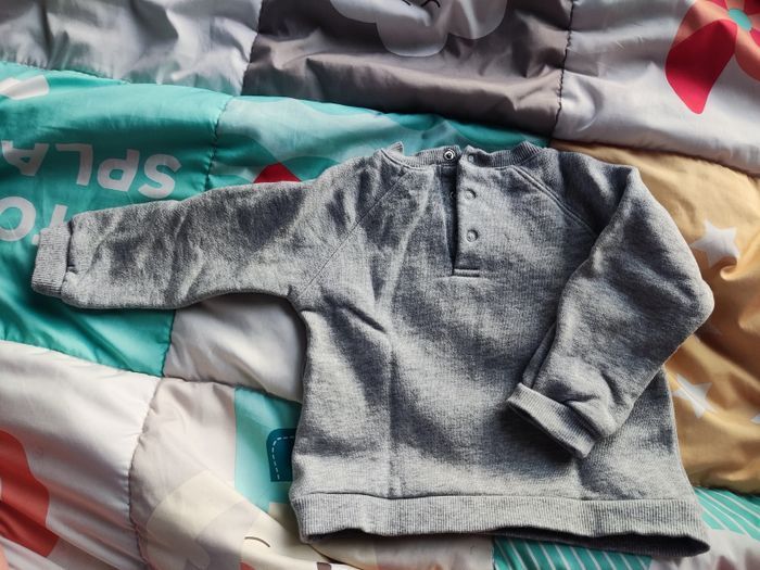 Sweatshirt gris avec broderie voiture sur le devant. Fermé par des pressions sur l'arrière. Marque Bout'chou Taille 9 mois. Neuf, jamais porté