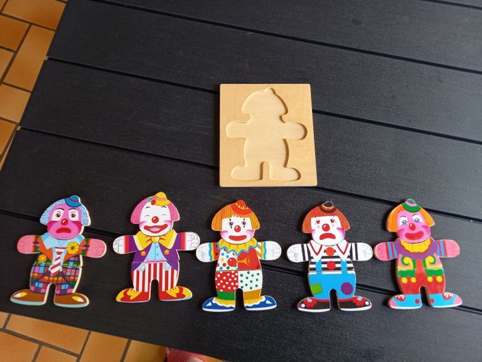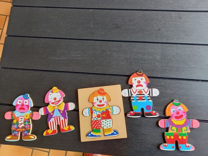 Mr Clown, puzzle en bois J'ai 5 tenues différentes , à toi de trouver la bonne Je peux être rieur ,gai, joyeux ou peiné . Je t'attend, à très vite Manque la boîte Bon état général.
