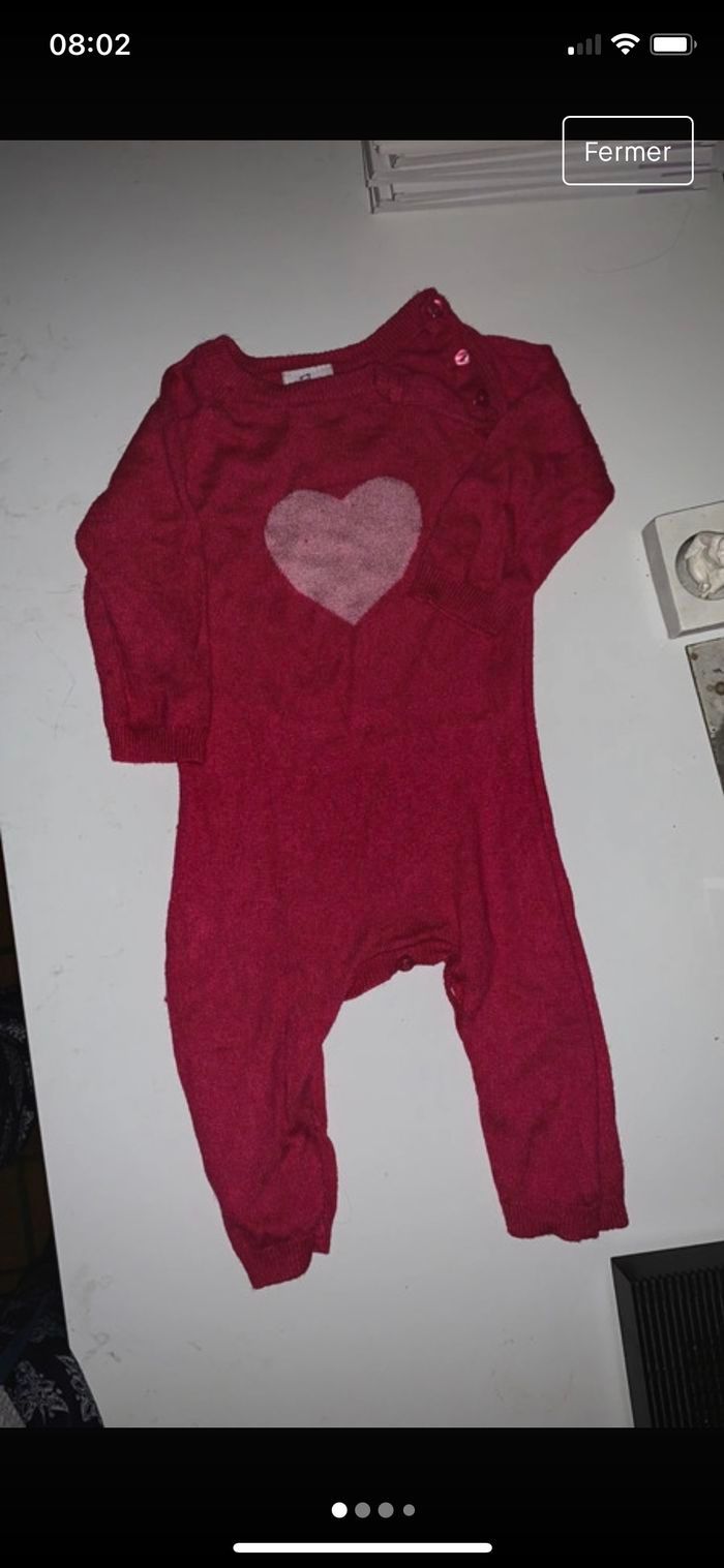 Jolie combinaison bébé avec petit bouton en forme de cœur en haut coter gauche et petit bouton rond au milieu des jambes pour fermer la combinaison cette combinaison et une combinaison sans pied . Agréable à porter matière très douce