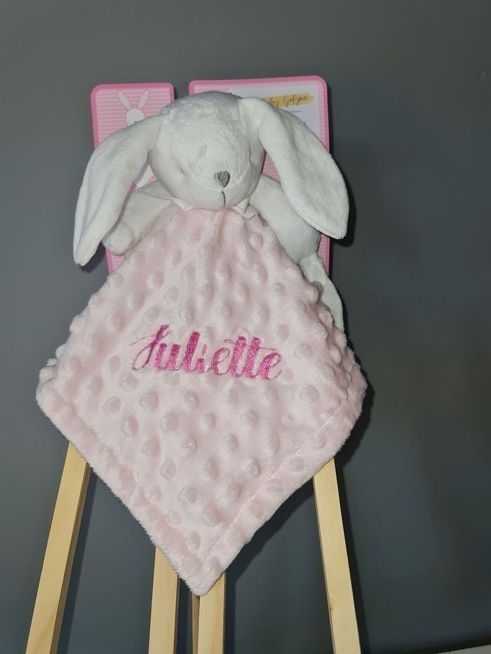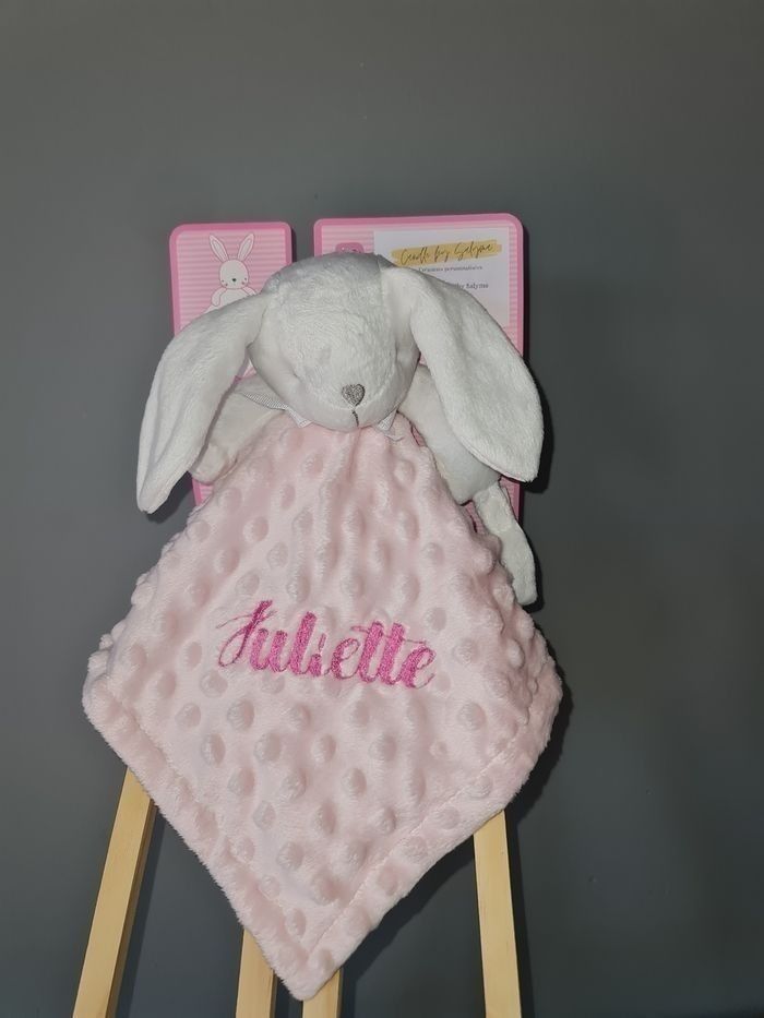 Doudou lapin couleur rose Avec languette attache tétine au niveau de la main Prenom broder : couleur et l'écriture reste à choisir N'hésitez pas à me laisser un message avant de valider l'achat Merci