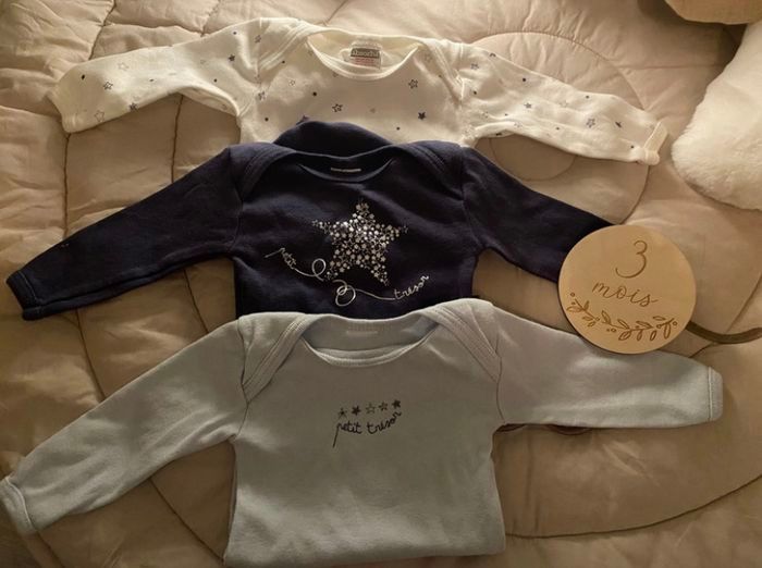 Lot de 3 bodies manches longues, ouverture par le bas En parfait état N’hésitez pas à faire un tour dans mon dressing, j’ai d’autres articles en 3 mois (pyjamas, ensembles)