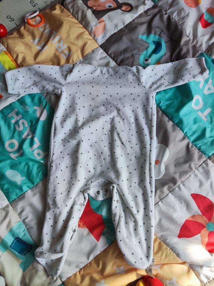 Pyjama blanc imprimé étoiles grises avec un petit mouton trop mignon. Très bon état Taille 9 mois Marque: Gémo