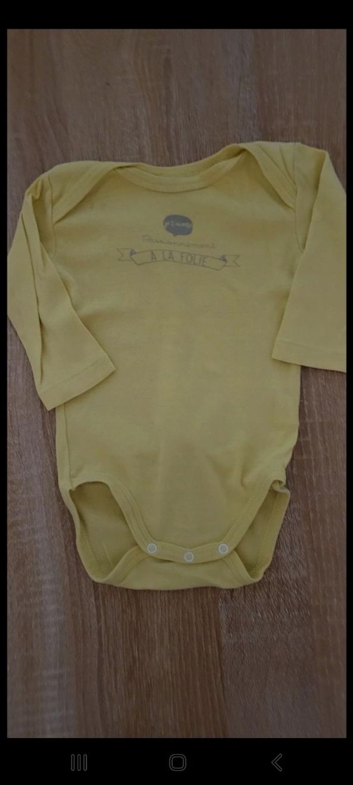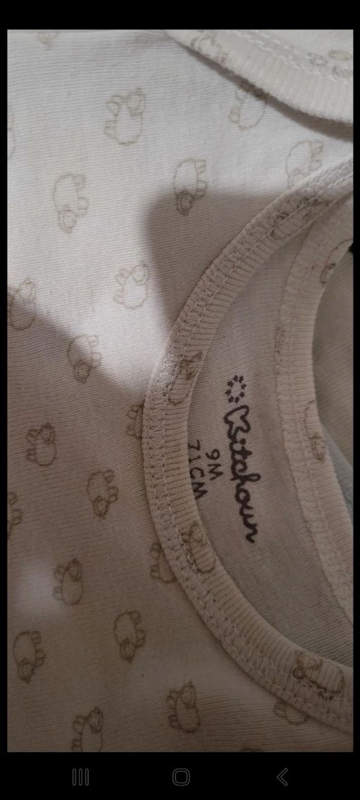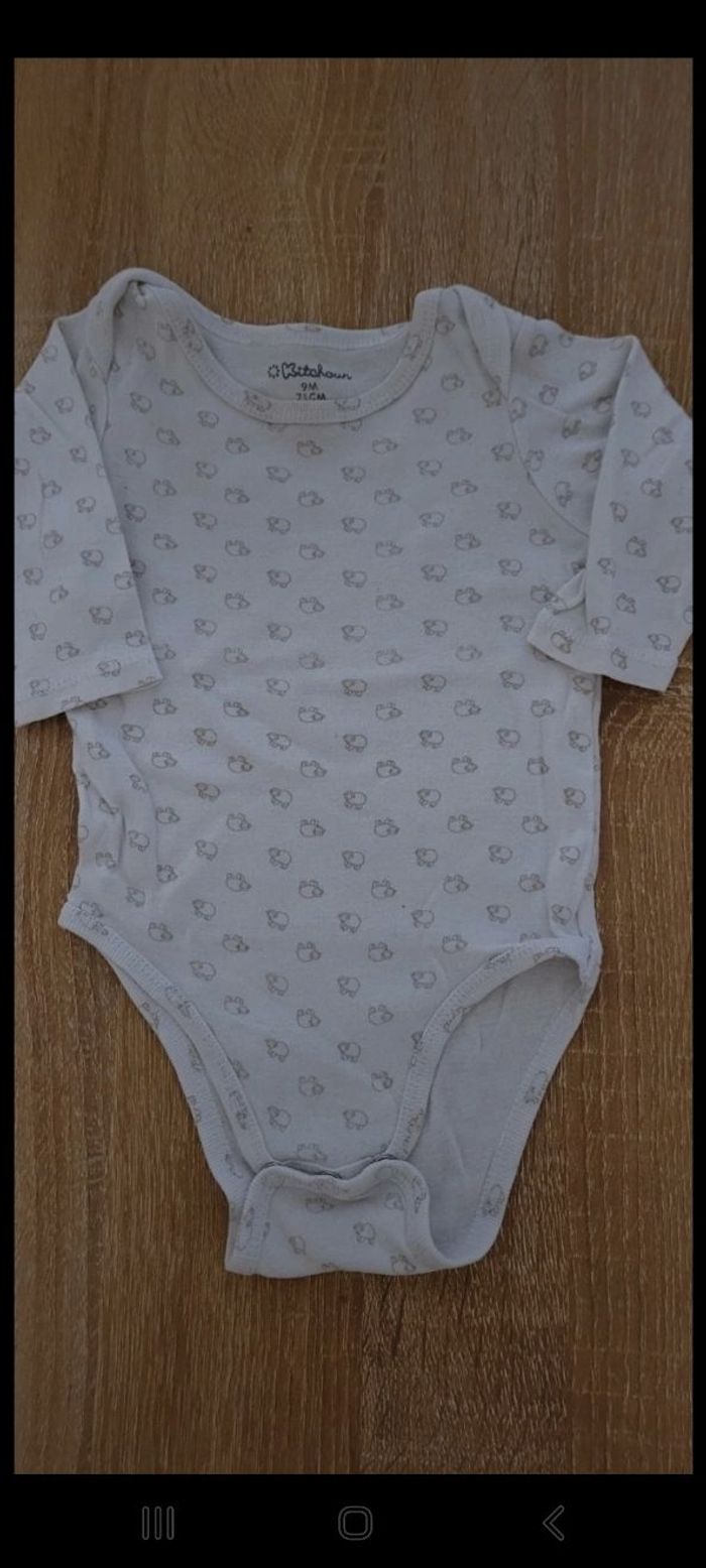 Lots de 4 bodies Taille : 9 mois Marque : 2 kitchoun, 1 influx, 1 je sais pas . Prix 1.50€ ⚠️ 2 avec deux mini taches voir photos ⚠️