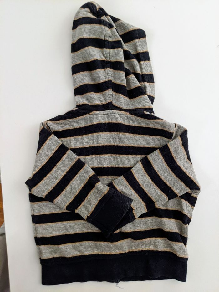 Magnifique gilet cardigan à capuche zippé IKKS 18 mois 81 cm Mixte parfait pour fille et garçon Gris chiné Rayures noires entourées de lignes orange Entièrement doublée Super qualité Fines bouloches sur la doublure. IKKS bon état Tissu un peu blanchi au niveau zip et extrémités des manches #yipin_bebe_18mois #yipin_bebe_18mois_fille #yipin_bebe_18mois_garcon #yipin_bebe_18mois_mixte