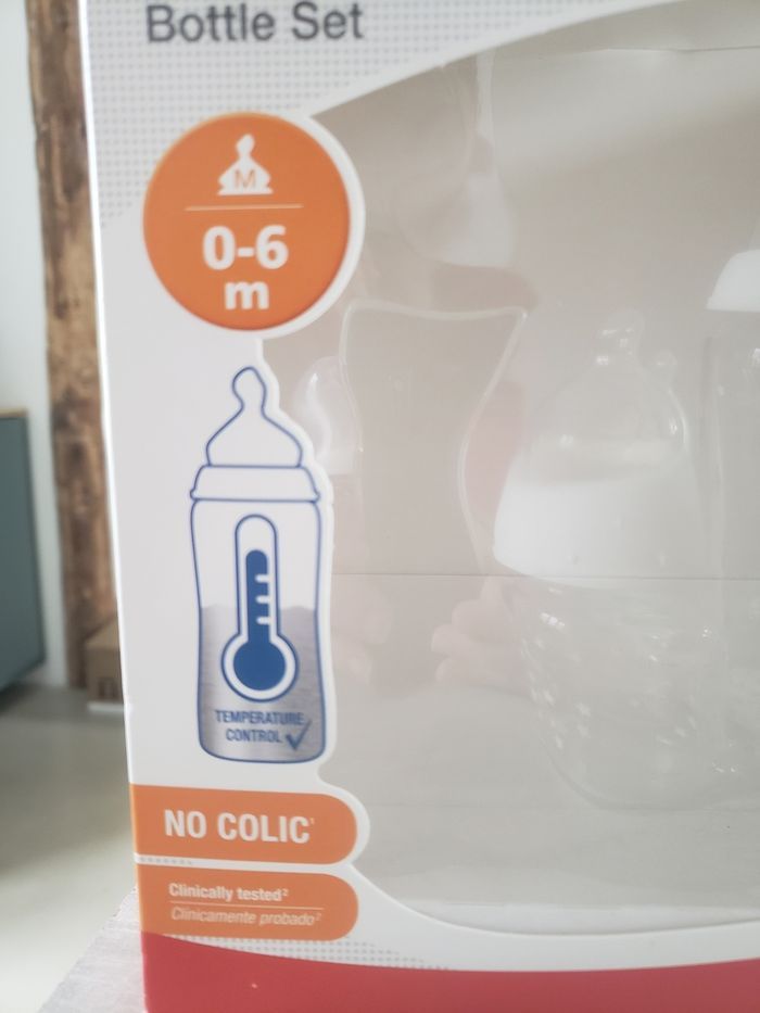 Biberons en verre en parfait état. 2 tétines neuves (1 S et 1 M), avec les capuchons. Je donne 7 tétines 0-6 mois utilisées mais en bon état, les stérilisations les ont rendus blanches pour certaines. Vendus dans leur emballage, et je donne le casier de rangement aussi.
