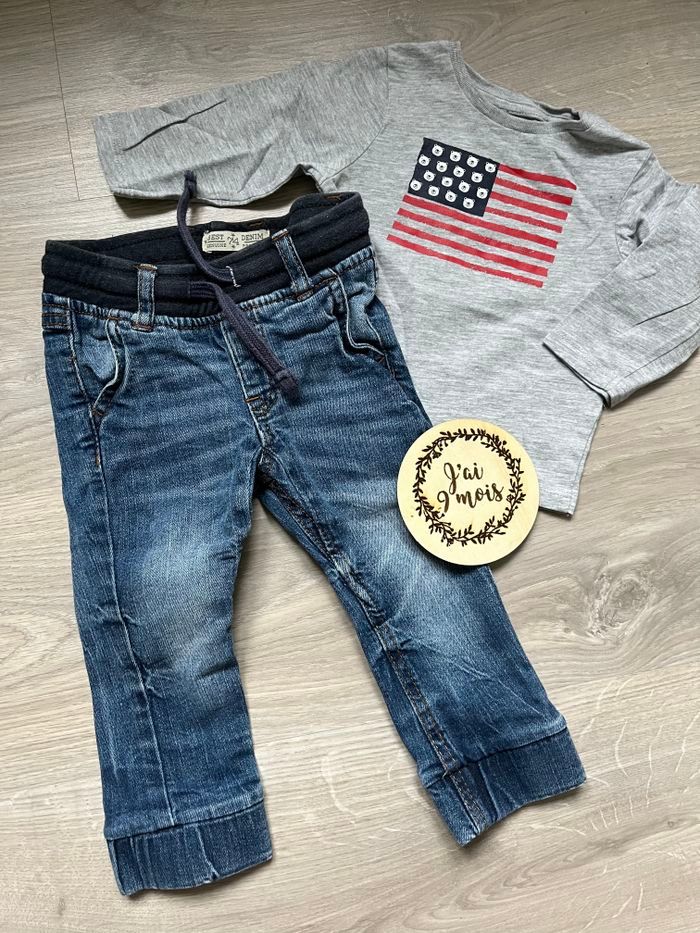 Ensemble avec un tee shirt manches longues avec un dessin de drapeau et un jean 9 mois Tee shirt pat et ripaton Pantalon demin