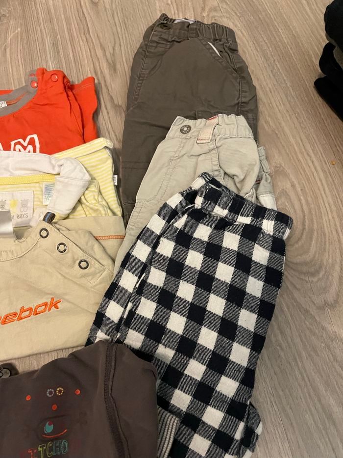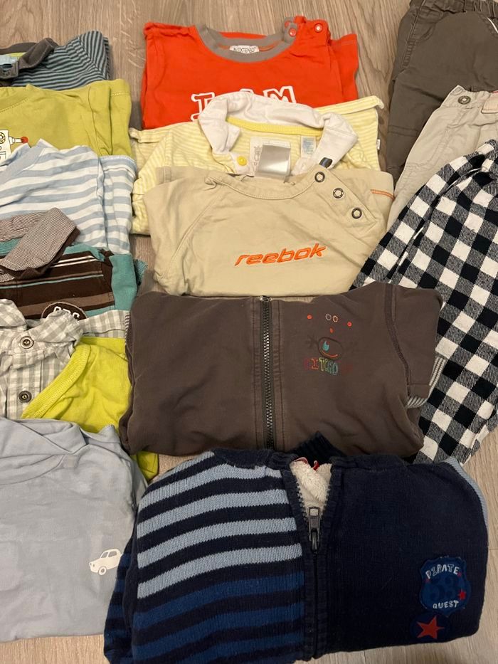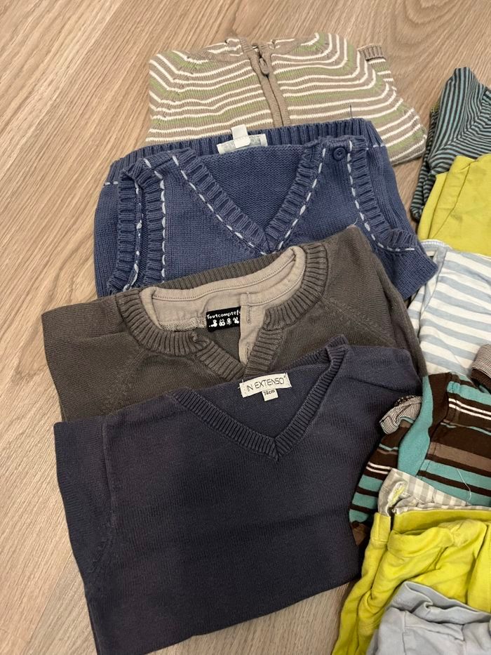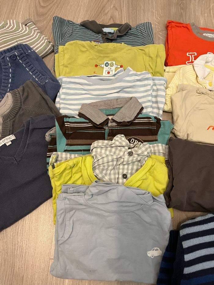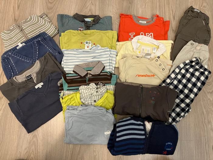 Lot composé de 18 vêtements dont - 3 pulls fin - 3 gilets - 3 pantalons - 6 tee shirts manches longues - 3 tee shirts manches courtes.