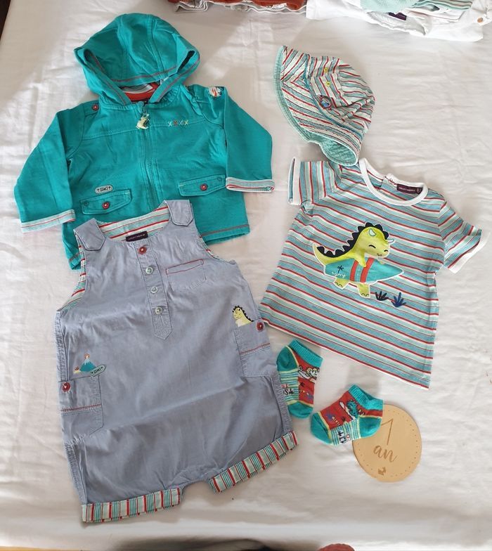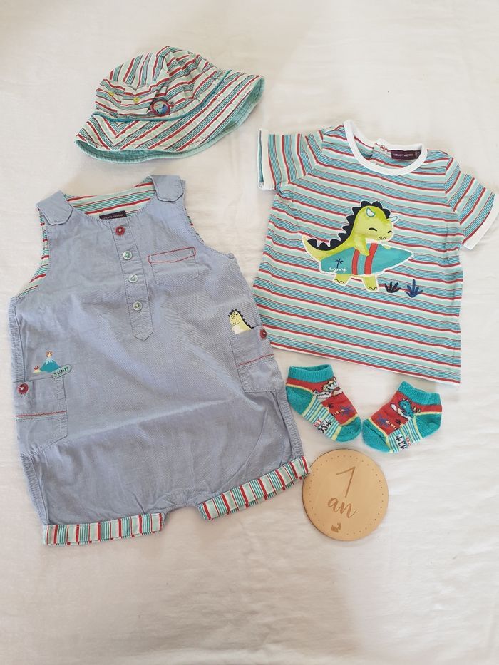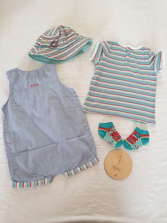 Une salopette, un tee-shirt,une veste, paire de chaussettes et chapeau réversible T3
