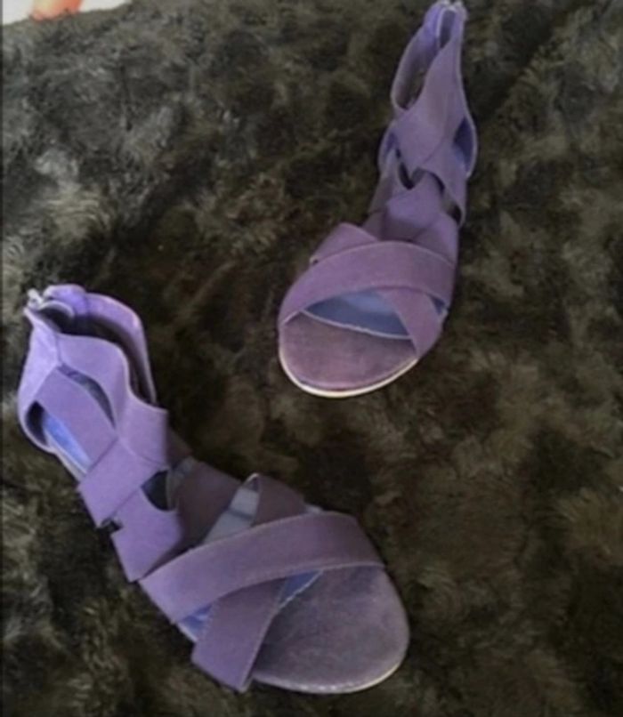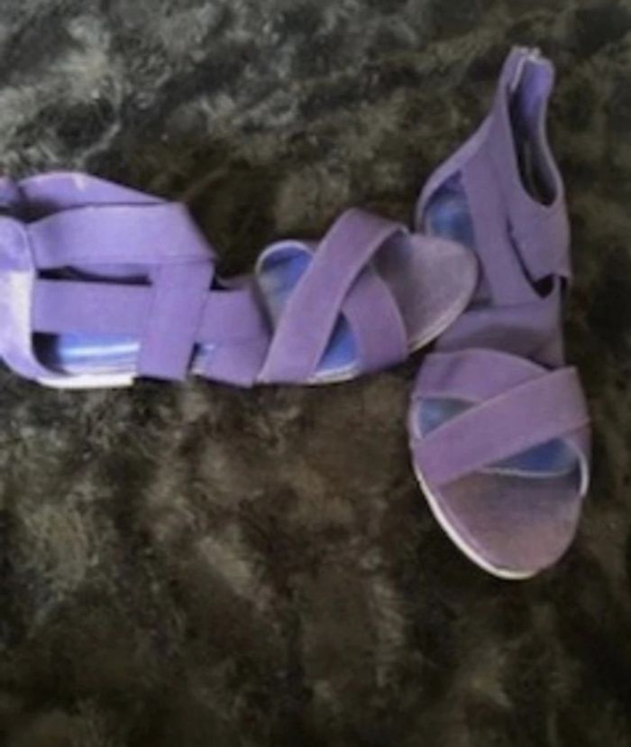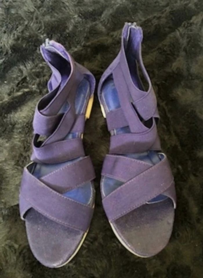 Sandale plate avec brides élastiques Jeu de brides élastiquées sur le cou de pied et cheville. Contrefort arrière fermé par zip pour faciliter l'enfilage. Dessus élastique en textile. Semelle intérieure imitation cuir. Semelle extérieure gomme élastomère pour le talon plat. Talon plat 1 cm environ. Pointure : 38 Coloris : bleu Prix : 15€ #sisterkayachaussurefemme38 Neuve jamais portée Réf : b.ci