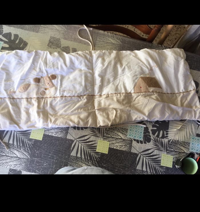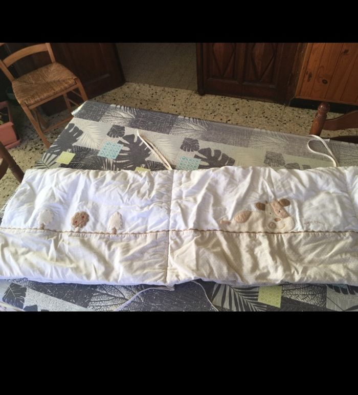 En très bon état molletonné de couleur beige blanc avec motifs animaux. Tour de lit longueur 1.63m et largeur 40 cm. Housse de couette 108 cm X 56 cm avec bordure