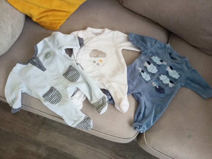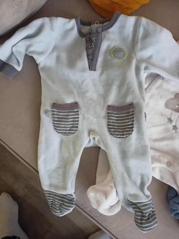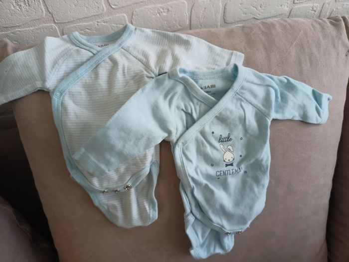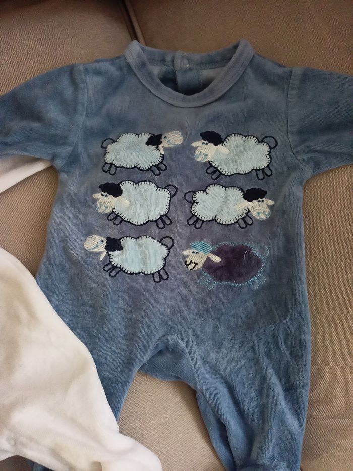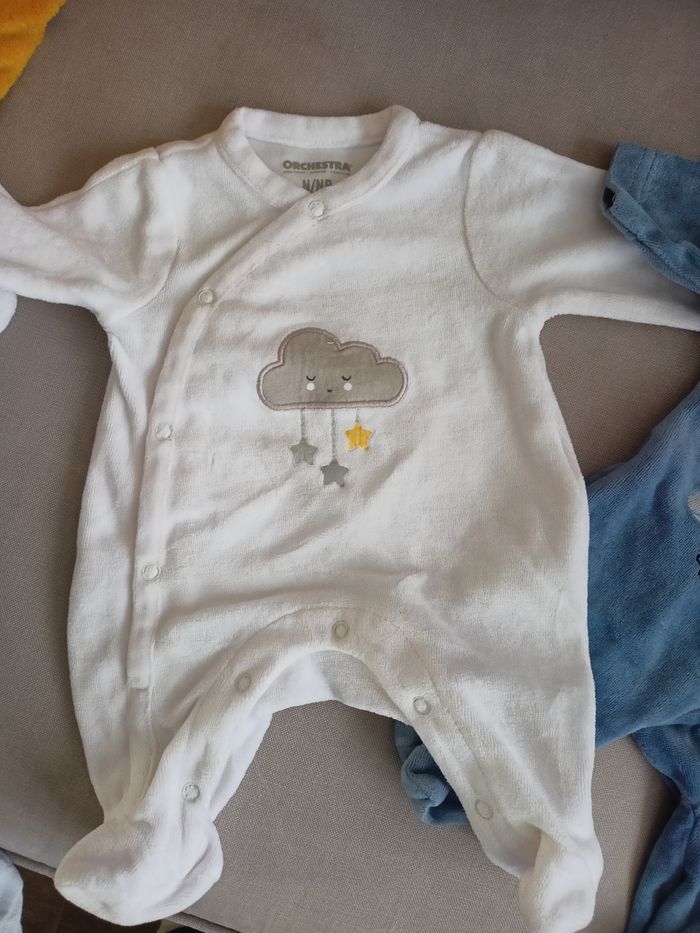 3 pyjama + 2 body Taille naissance 0 mois Un pyjama bleu pastel et gris Okaïdi Un pyjama crème avec petit nuage orchestra Un pyjama marque inconnue bleu avec petit moutons 2 body manches longues fermeture croisée Kiabi 0 mois