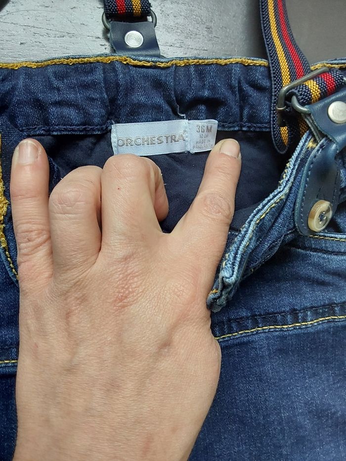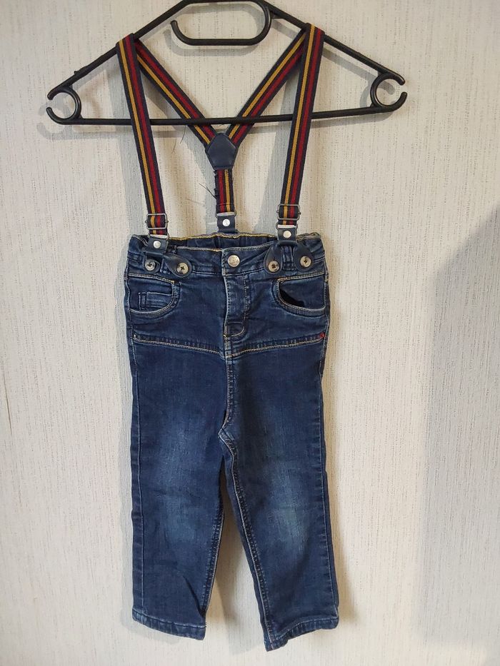 Pantalon jean à bretelles détachable. Taille haute avec une jolie chemise à carreaux pour un effet bûcheron. Taille 36 mois comme neuf