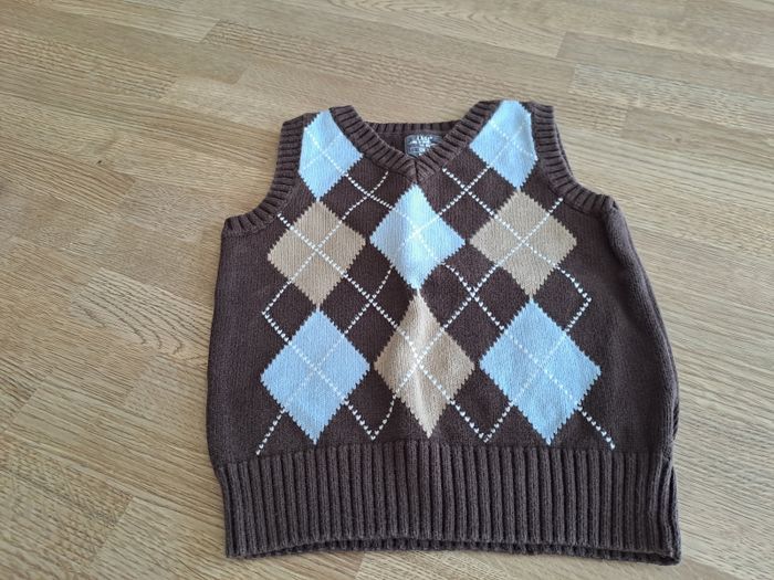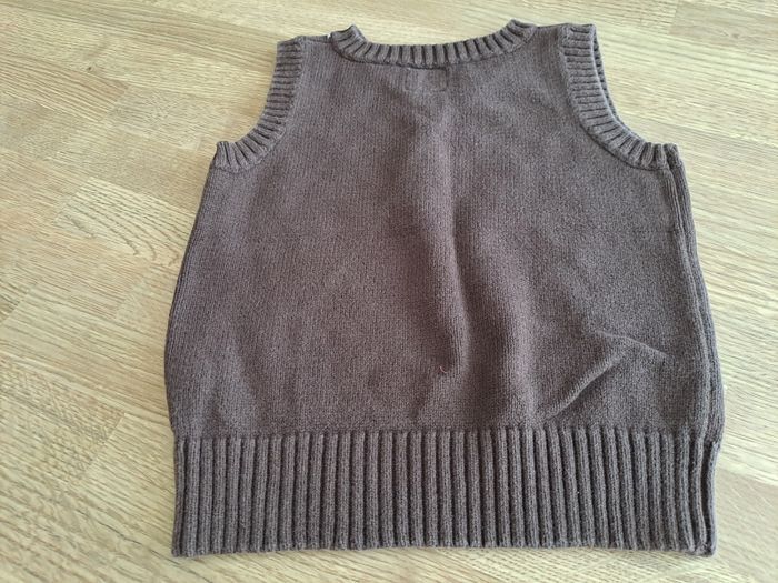 1) Gris clair, U tout petit, 12 mois, coton acrylique, en très bon état. 2) Débardeur, H M, marron, 12 mois, coton, en très bon état. 3) Pull marin, 12 mois, coton, en très bon état.