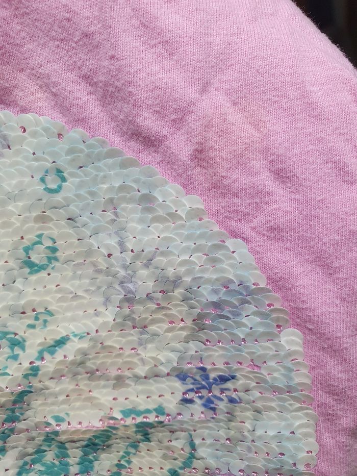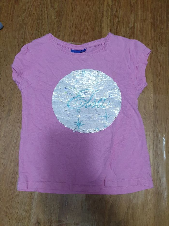 Tshirt avec sequins réversibles. Elsa. Il y a une tache pas très visible en dessous les sequins.