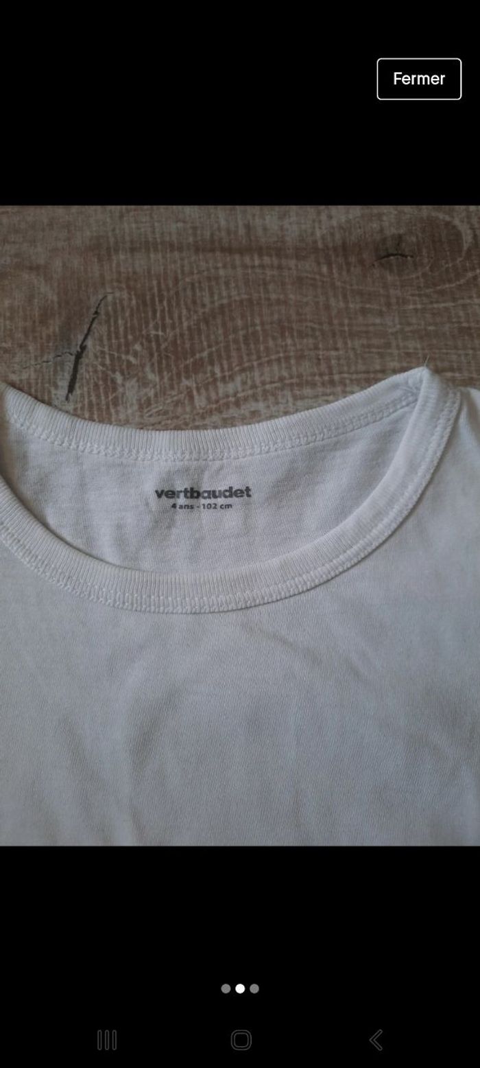 T shirt manches courtes blanc verbaudet taille 4 ans /102 cm . Très bon état juste étiquette à l interieur qui est à été coupée ( cf photo ) 100% coton