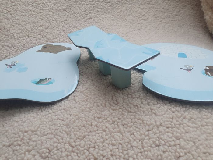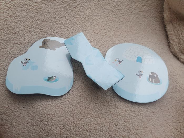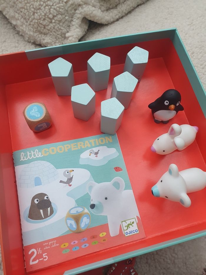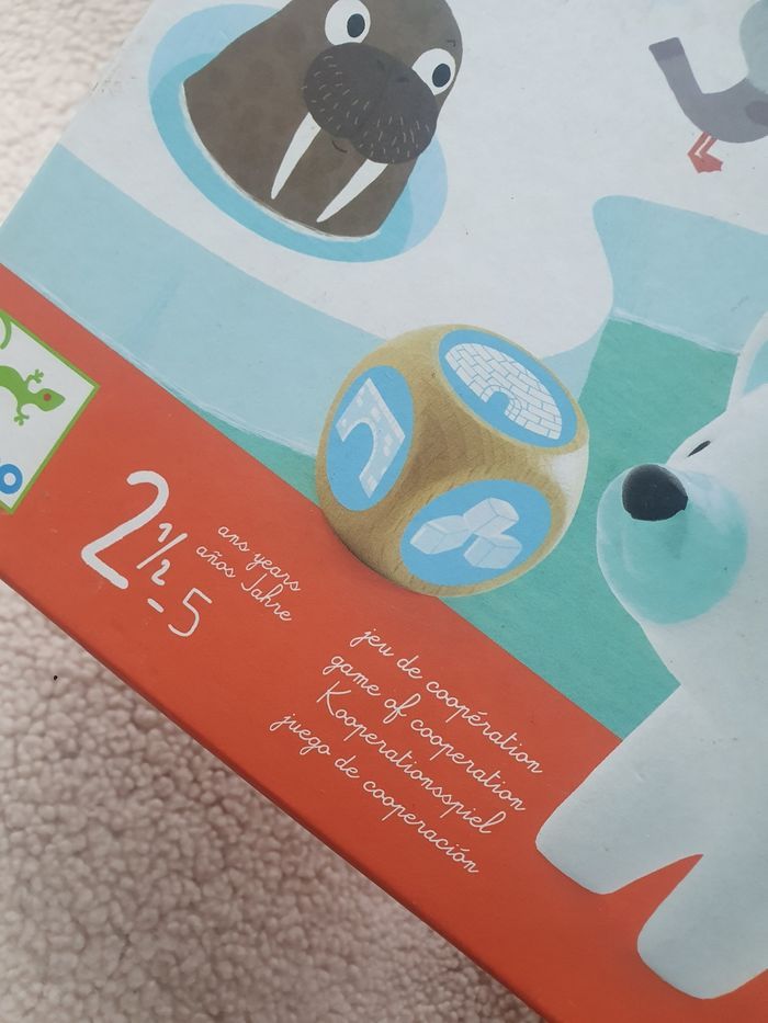 Jeu éducatif Jeu de coopération 2/5ans Sur la banquise, des animaux tentent de regagner leur igloo. Attention car le pont de glace menace de s'écrouler. Un jeu qui se joue en coopération pour apprendre à jouer et à gagner tous ensemble. Chacun son tour, les joueurs lancent le dé. S'il tombe sur le dessin "glaçon " un pilier du pont de glace doit être enlevé.. Attention à l'écroulement du pont avant que tous les animaux ne soient rentrés ! Ps: manque le personnage du petit renard.le reste est intact!