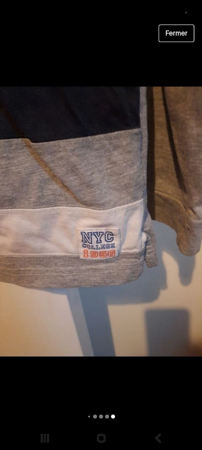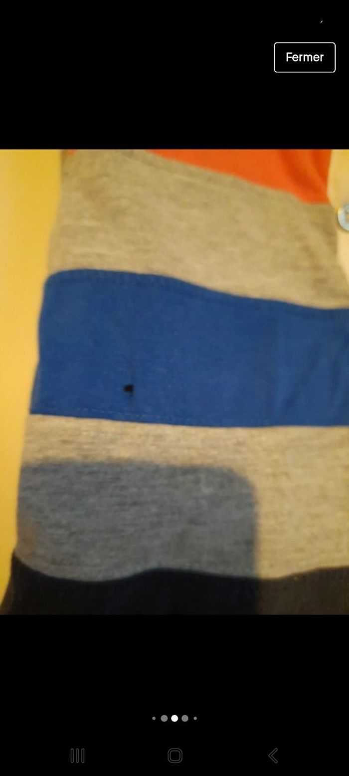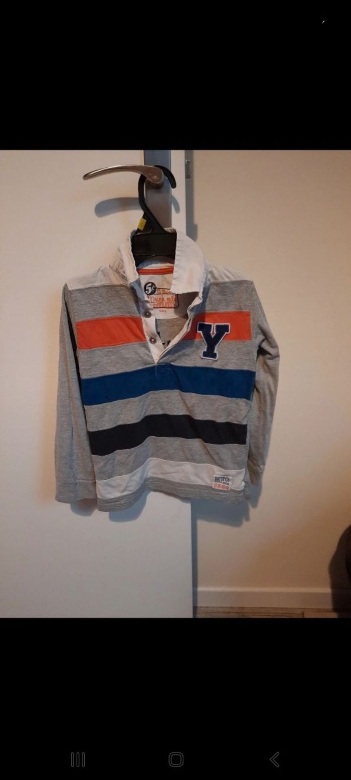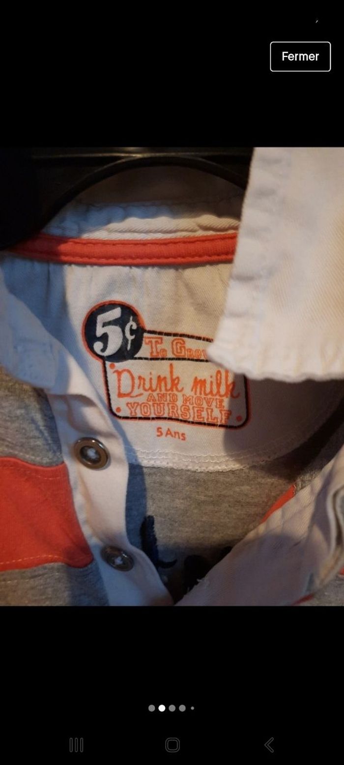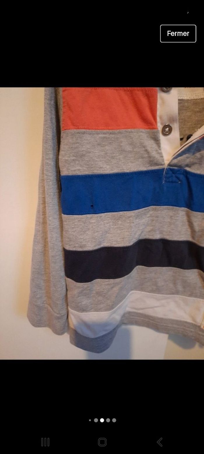 Polo manches longues taille 5 ans , coton et polyester , il y a un petit trou sur la bande bleue ( cf photo ) sinon RAS . Pour la marque je ne sais pas trop , j ai mis 2 étiquettes en photo.