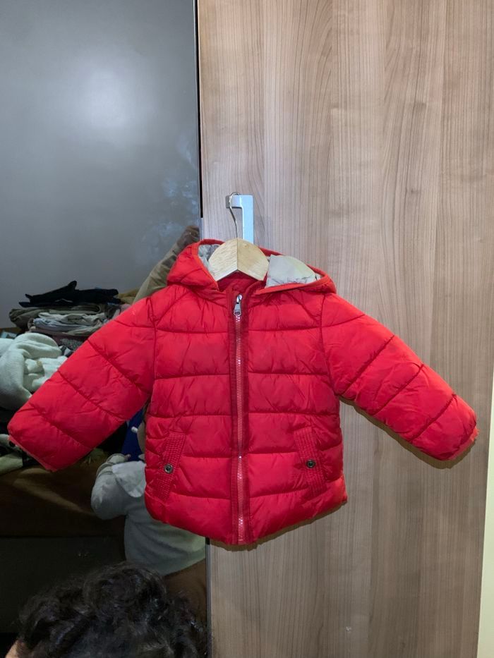 Manteau mixte rouge, De marque Zara taille 80 cm (9-12 mois) Fourrure en laine à l’intérieur + capuche Prix initiale en magasin : 49,99 euros