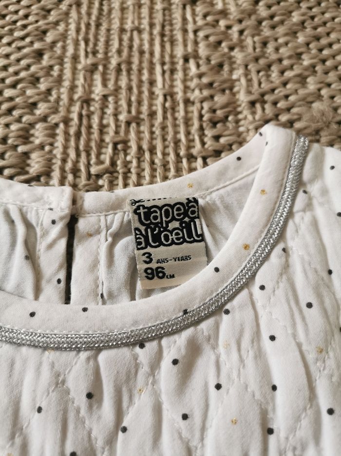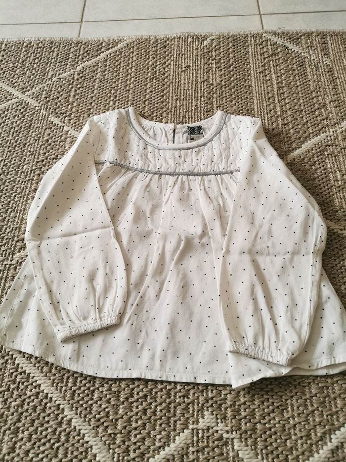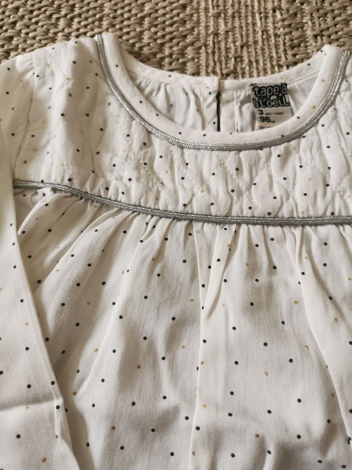 Blouse blanche en excellente état Détail argenté autour du cou Petits pois noirs et dorés 3 ans
