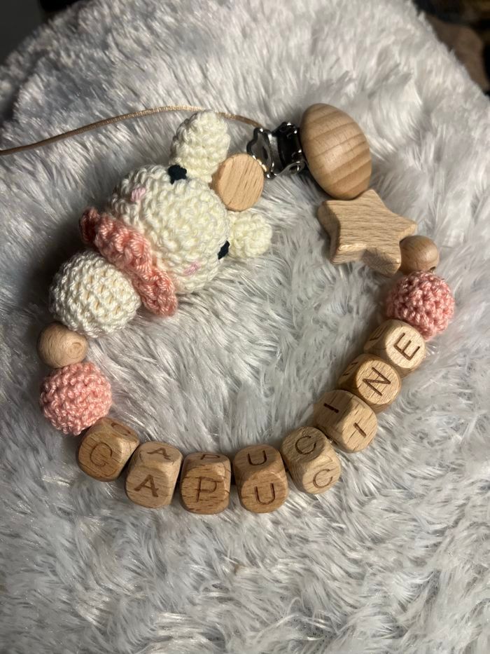Attache tétine personnalisé en silicone ou en bois au souhait de l’acheteur . Personnalisable au choix de l’acheteur que ce soit la couleur comme le prénom ou le thème . Le fil est doublé pour plus de sécurité tout le long de l’attache tétine. N’hésitez pas à me demander et regarder mon dressing. Une photo vous sera envoyée avant l’expédition pour vous ayez un aperçu du rendu. Tous les produits sont réalisés avec du materiel spécial conçu aux bébés , enfants.