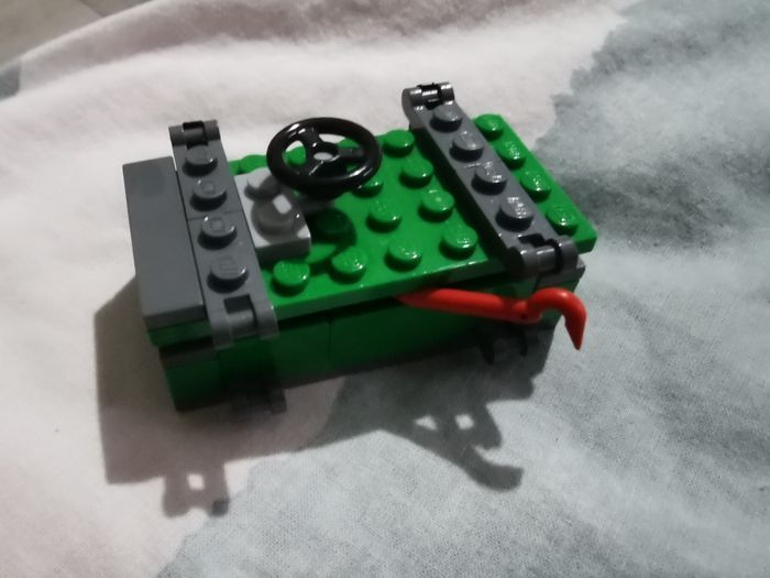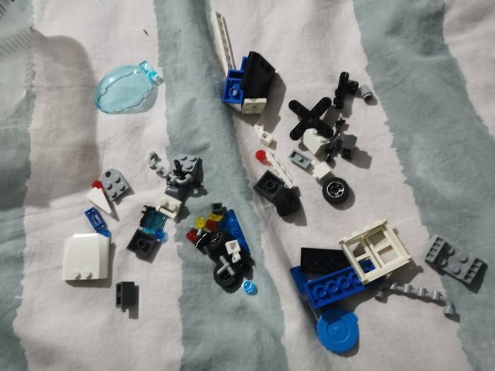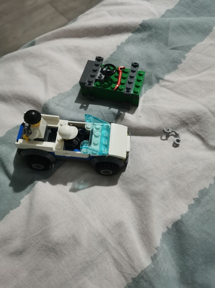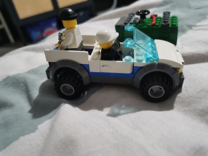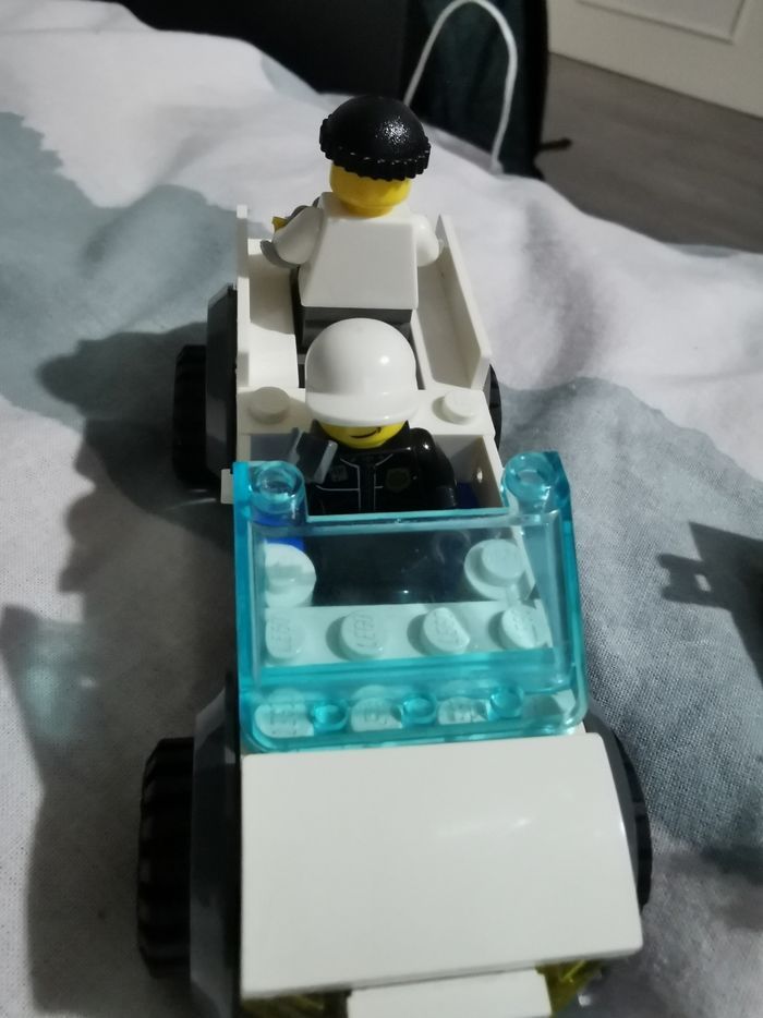 Une voiture de police lego avec un voleur et un policier puis un coffre fort (si vous souhaitez recevoir les petites pieces avec le reste il vous suffira de me prévenir et je vous les offre)