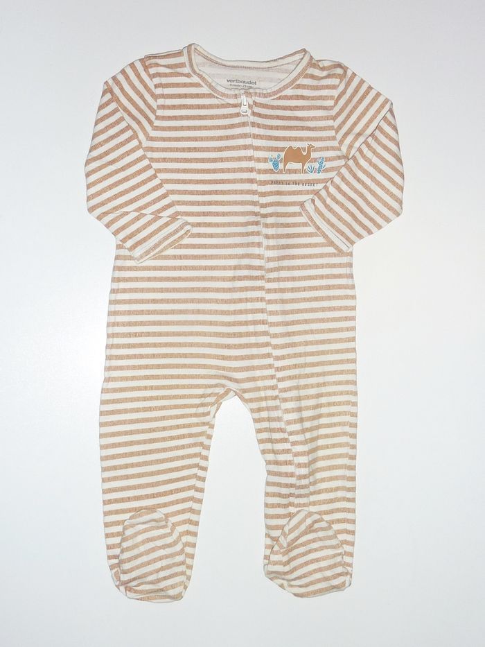 Le parfait petit pyjama d'occasion pour les nuits de votre bébé. Pyjama de marque VERT BAUDET en coton, rayé beige te camel, imprimé et fermeture zippée devant, en excellent état.