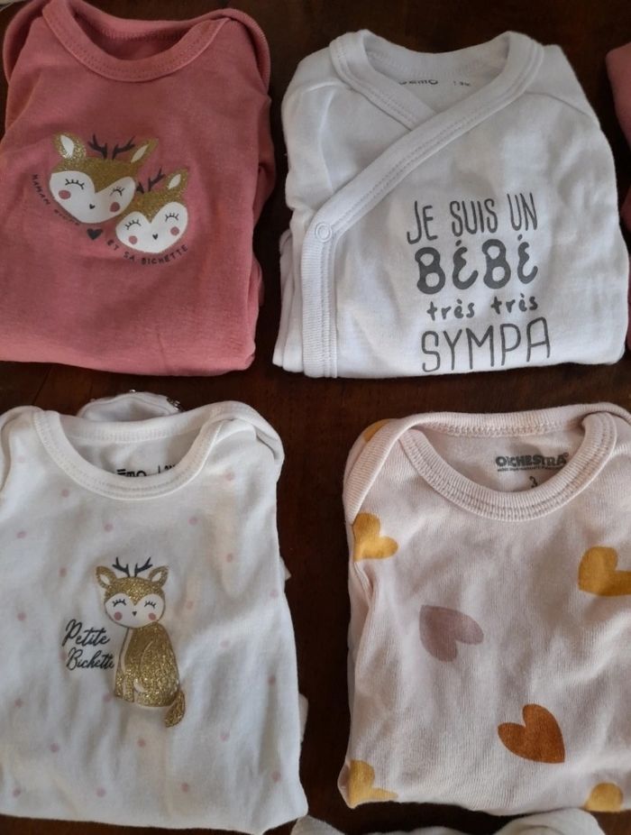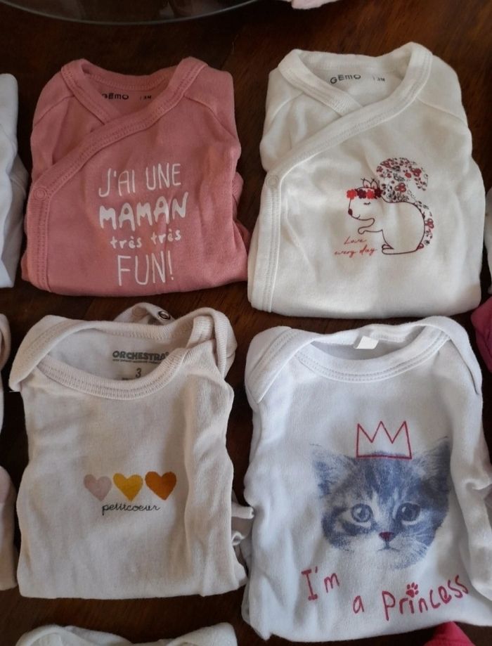 Lot de bodys fille 3 mois - 60-62cm 14 pièces à manches longues Dont 3x avec pressions à l'avant - 5 bodys GEMO (dont 3 ouverture avant) - 2 bodys ORCHESTRA - 1 body DISNEY - 2 body INEXTENSO - 1 body KIABI - 3 body SANS MARQUES La moitié n'a jamais été porté !