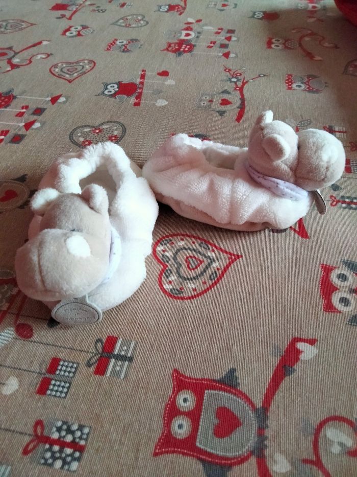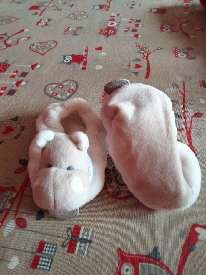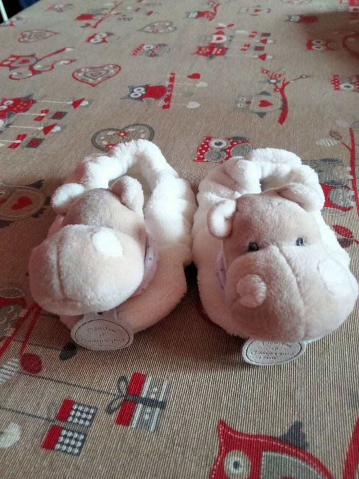 Chaussons hochet avec grelot dans la tête de l hippopotame, de taille 0-3 mois en parfait état. Ce sont des chaussons en peluche de chez doudou et compagnie