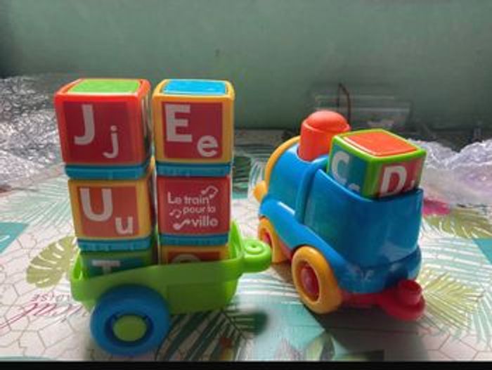 Train alphabet de la marque ( Bkids ) et en parfait état.. je le livre avec les piles .il fait de la musique et parle .très ludique pour enfants de 12 mois à 24 mois .