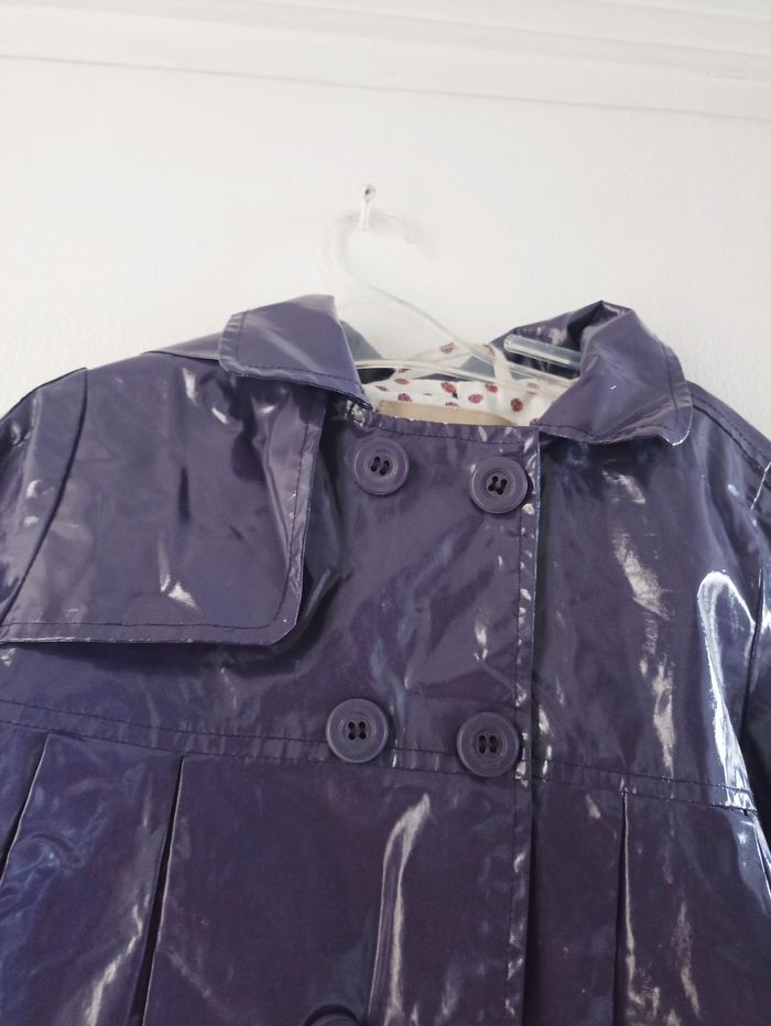 Ciré violet avec capuche. Se ferme avec des pressions. Capuche
