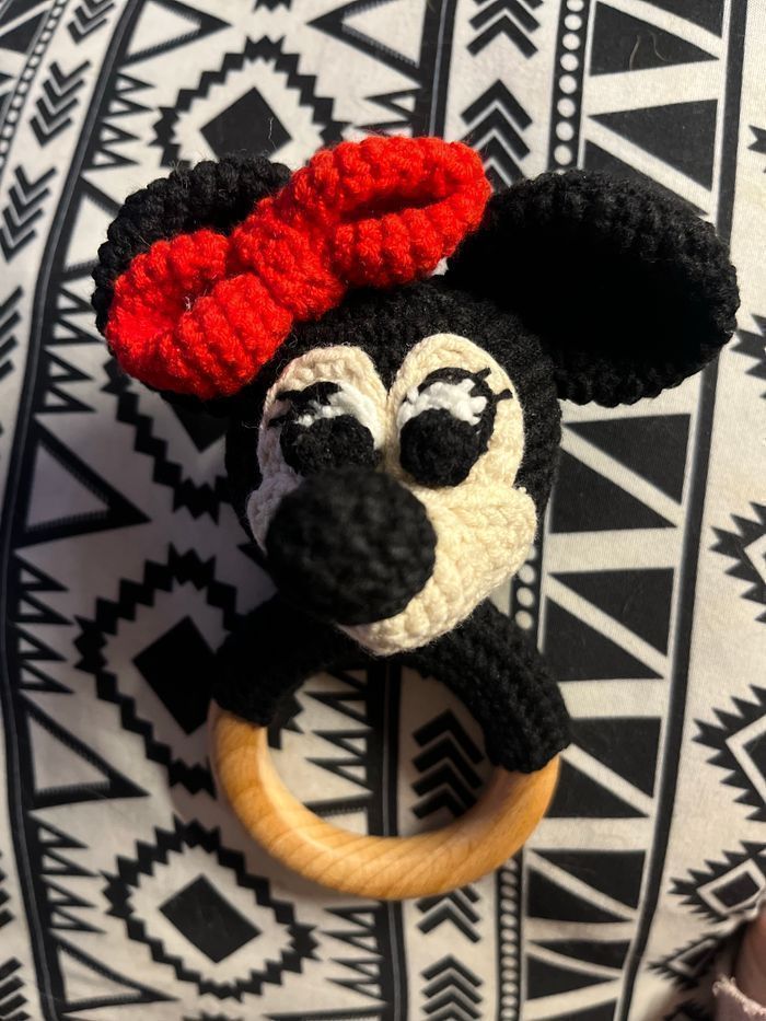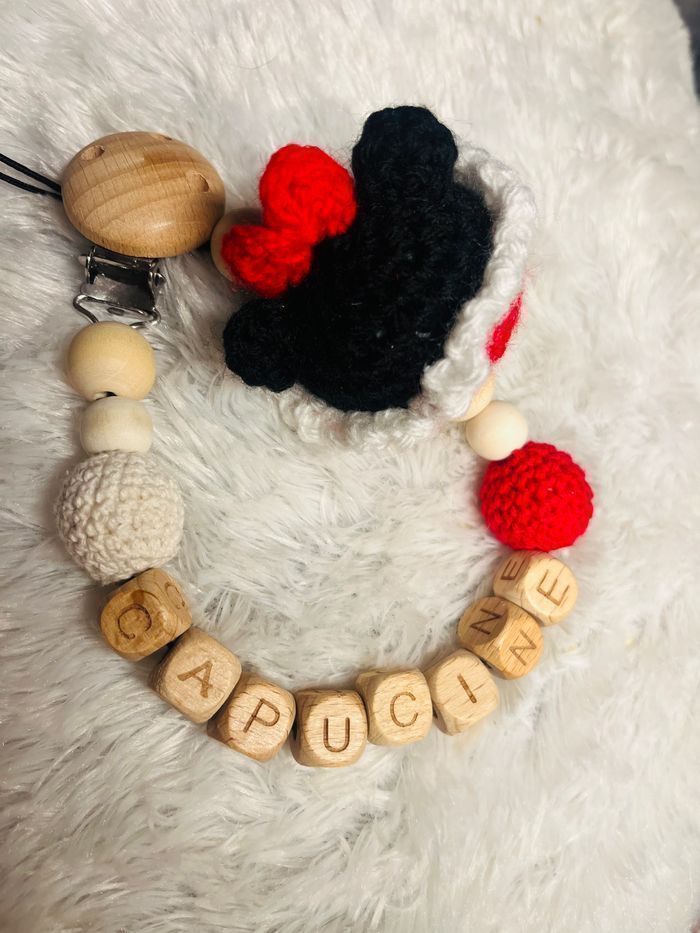 Hochet minnie et attache tétine Minnie, possible de vendre séparément Fait à la main Normes CE 100% coton Bois de hêtres naturel et non traité Absence de substance toxique Éveil les sens du bébé Hochet pour stimuler les sens de bebe , rien de tel d’un hochet aux couleurs chaleureuses et à la texture de coton agréable. Il permet d’accompagner et de rassurer bébé dès ses 3 mois.