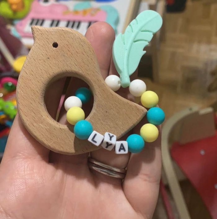 Anneau de dentition personnalisé en silicone ou en bois au souhait de l’acheteur . Personnalisable au choix de l’acheteur que ce soit la couleur comme le prénom ou le thème . Le fil est doublé pour plus de sécurité tout le long de l’anneau de dentition. N’hésitez pas à me demander et regarder mon dressing.
